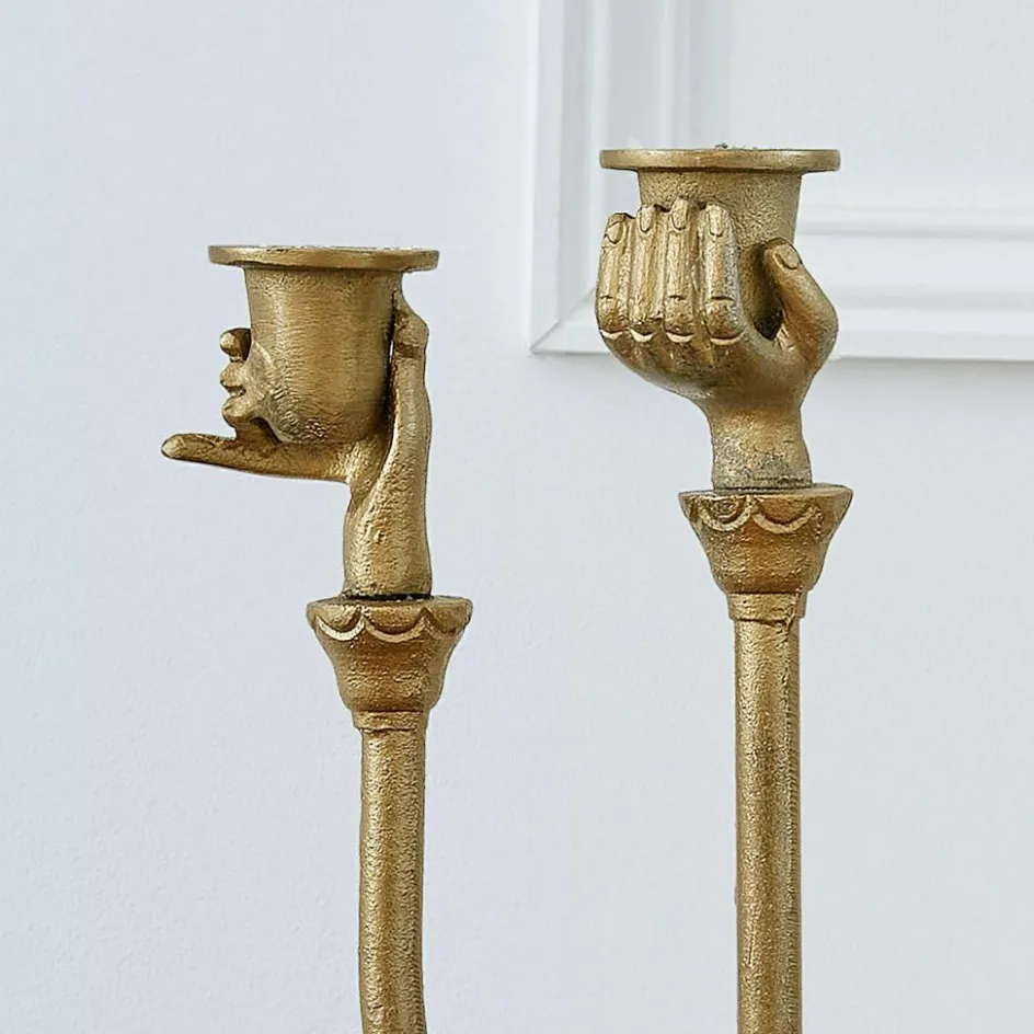 Ein außergewöhnliches Dekorationsstück, das Geschichte erzählt: Dieser kunstvoll gestaltete Kerzenhalter aus Aluguss erinnert an klassische Vintage-Elemente mit einer Prise Extravaganz. Die drei filigranen Hände, die die Kerzen stilvoll emporheben, machen ihn zu einem charaktervollen Kunstobjekt. Das Antikmessing-Finish verleiht der Oberfläche eine warme, nostalgische Tiefe und lässt das Licht der Flammen besonders stimmungsvoll reflektieren. Ob als zentrales Highlight auf einer festlich gedeckten Tafel oder als harmonische Ergänzung eines kunstvollen Interieurs – dieser Kerzenhalter ist mehr als nur ein Accessoire, er ist ein Statement.