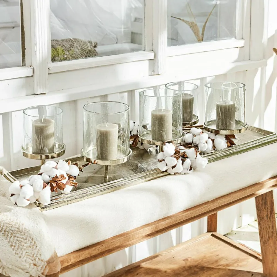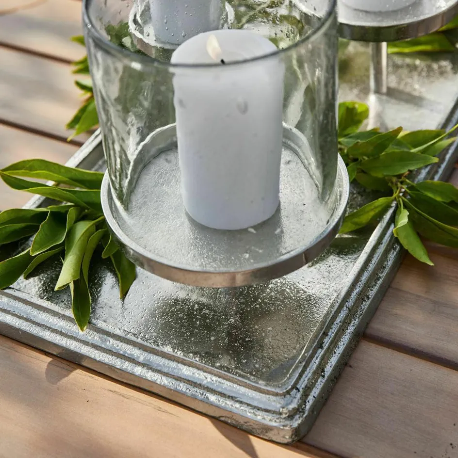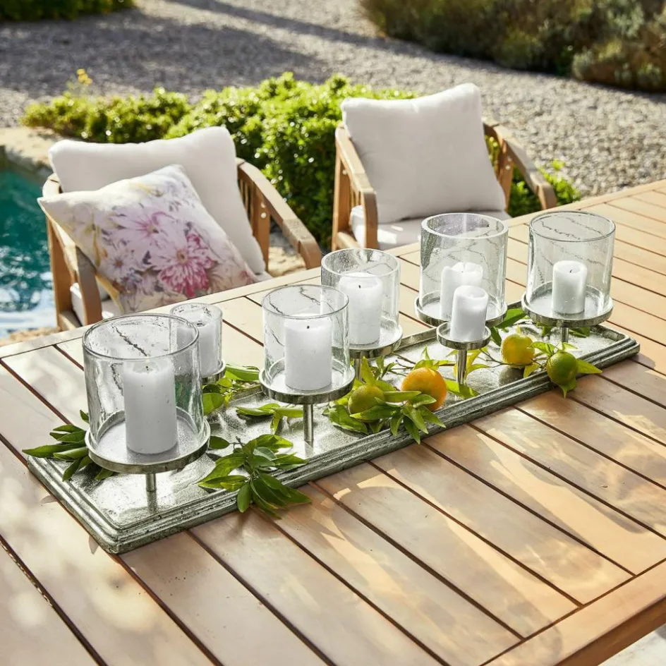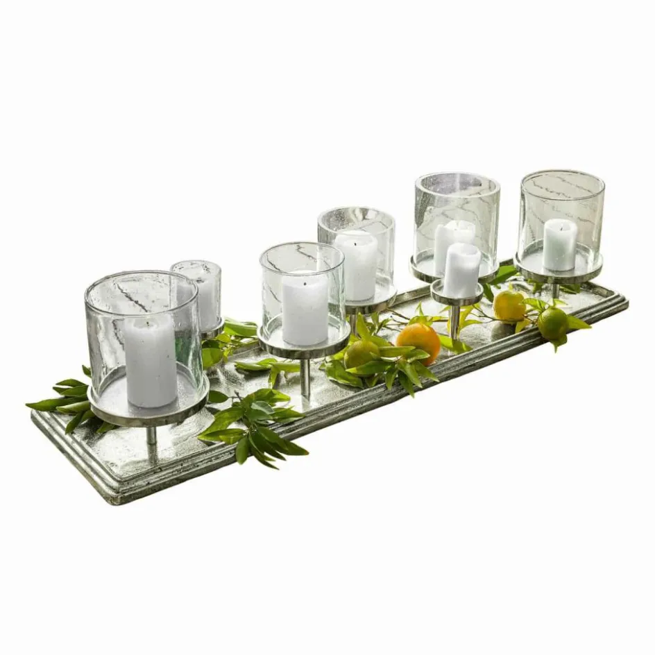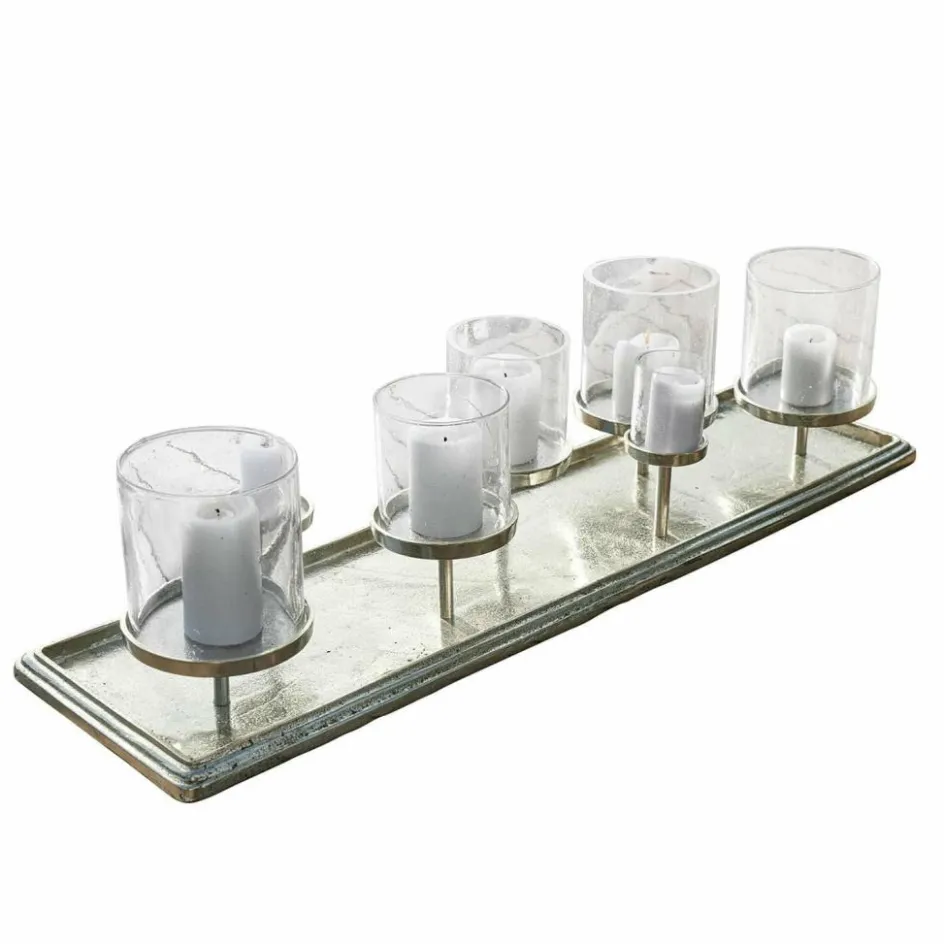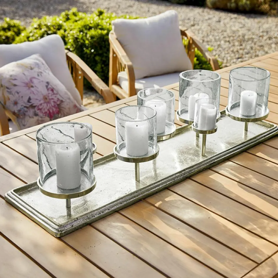 Dieses große, elegante Kerzentablett zaubert eine wunderbare Dekoration wie auch gemütliches Kerzenlicht zu Ihnen. Es besteht aus edlem Aluguss mit einer einzigartigen Sturkur, die beim Gussverfahren entsteht. Die darauf verteilten Windlichter sind aus mundgeblasenem Glas mit dekorativen Lufteinschlüssen gestaltet. Das stilvolle Design ist pur oder ganz individuell dekoriert eine Freude – Sie könnten etwa hübsche Steine oder Muscheln auf dem Tablett arrangieren und so Ihrem Zuhause immer wieder eine persönliche Note geben. Auf dem Balkon wie auch im Wohnzimmer zieht hiermit ein sehr stimmungsvolles Accessoire mit klassischem Charme ein. Alternativ könnten die gläsernen Halter auch mit Blüten oder Dekorativem bestückt werden.