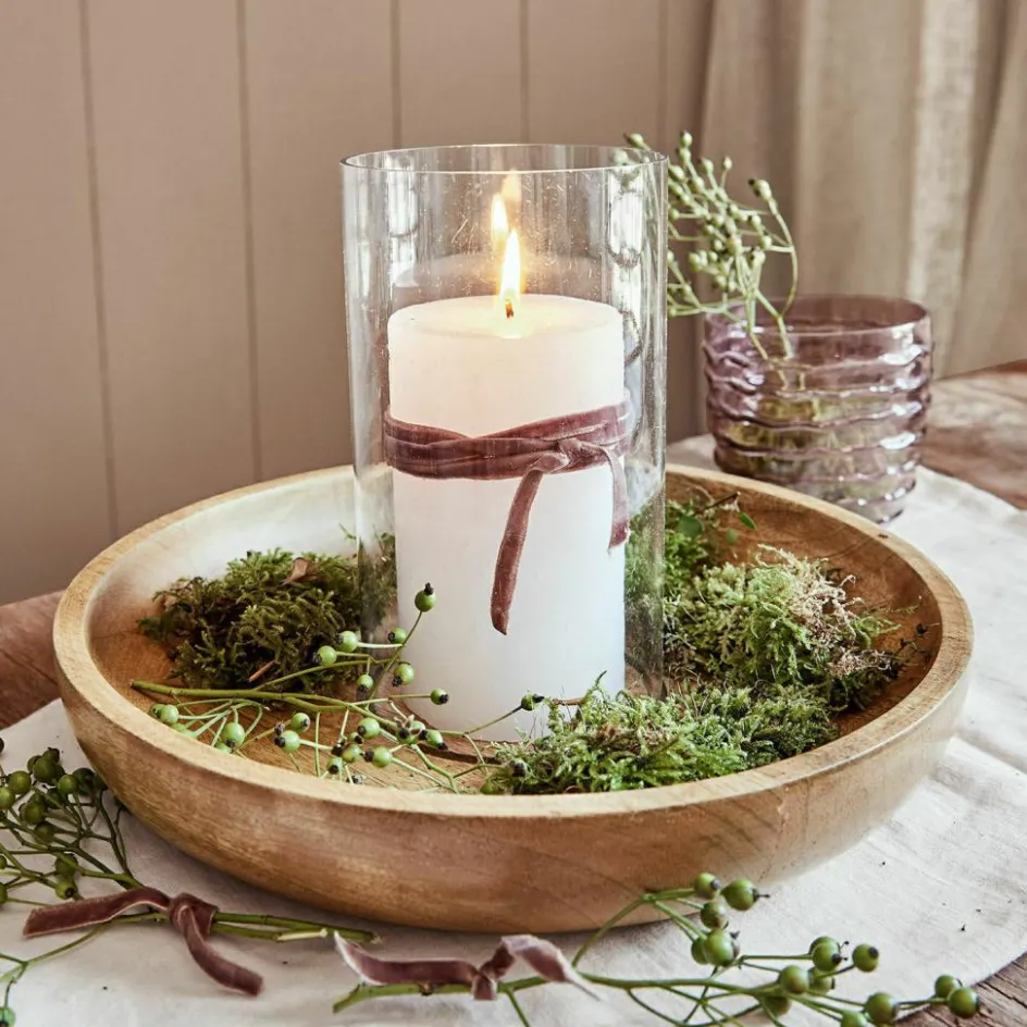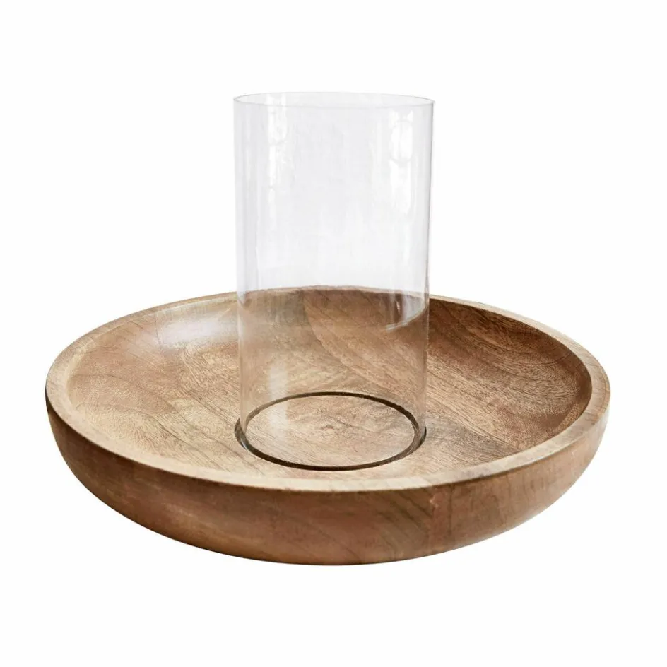 Dieses reizende Design bezaubert mit einem edlen Materialmix aus Mangoholz und einem Zylinder aus Glas. Es lässt sich bestens pur oder individuell dekoriert nutzen, vielleicht mit getrockneten Zitronenscheiben, Muscheln, Trockenblüten und mehr. Werden sie außerhalb des Glases platziert, kann auch nichts in die Flamme geraten. Innen können Sie eine Kerze drapieren und sich so immer über gemütliches Licht freuen. Die Dekoration können Sie auch saisonal immer wieder anpassen, um jederzeit einen ganz persönlichen Akzent in Ihrem Zuhause zu setzen. Der Glaseinsatz steht dank der Vertiefung stabil im Holz und kann einfach abgenommen werden. So kann der Teller auf Wunsch auch einzeln verwendet werden. Auf der Anrichte oder dem Tisch kommt so ein heimeliger und stilvoller Akzent in Ihr Heim, welcher jedem Interieur schmeichelt.