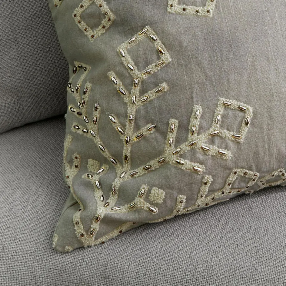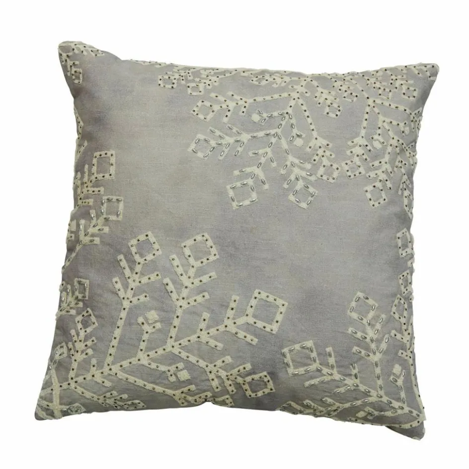 Wie glitzernder Raureif auf zarten Ästen entfaltet sich das Motiv dieser Kissenhülle: kunstvoll beflockte Schneeflocken zeichnen sich fühlbar auf dem gewebten Stoff ab – ein reizvolles Spiel aus Struktur und Textur. Goldene, silberne und champagnerfarbene Stabpailletten sind von Hand arrangiert und reflektieren das Licht bei jeder Bewegung. Die Ton-in-Ton gehaltene Farbwelt wirkt dezent und festlich zugleich, während die Kombination aus glatter Leinwandbindung und kuscheliger Oberfläche für eine behagliche Atmosphäre sorgt. Ob auf dem Sofa oder als Dekoration im Schlafzimmer – dieses Stück zieht die Blicke auf sich, ohne laut zu sein.