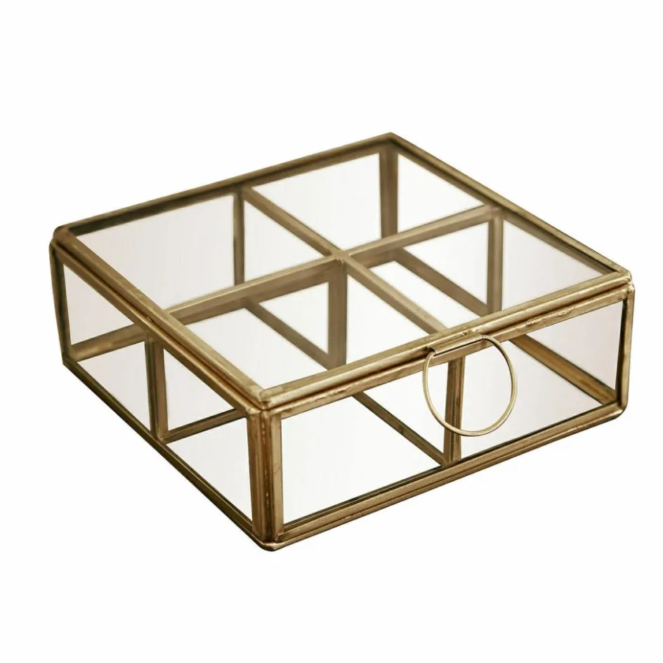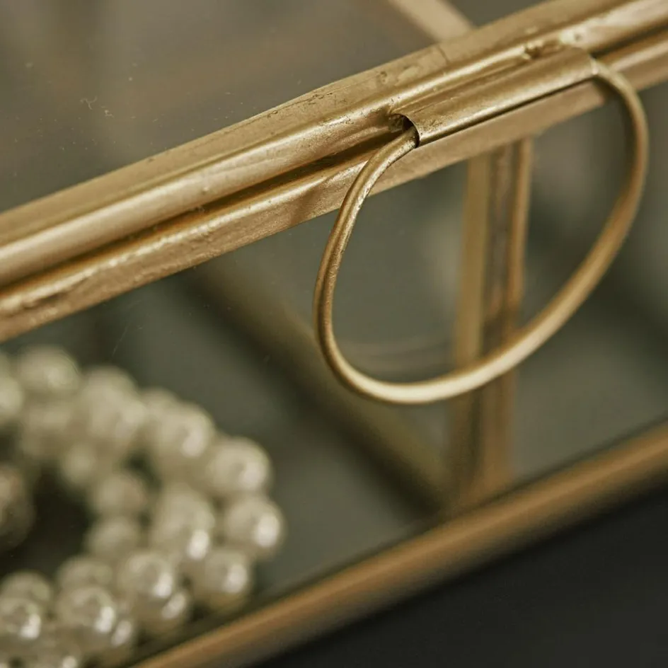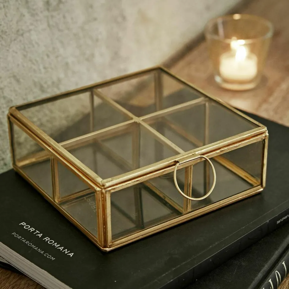 Aufbewahrungsboxen können mehr sein als nur praktische Helfer. Zum Beispiel dieses außergewöhnliche Modell aus Glas, kombiniert mit einem Rahmen aus goldfarbenem Edelstahl. Sorgfältig von Hand gefertigt und innen aufgeteilt in 4 Fächer wirkt es wie ein Schaukasten. Gerade ganz besondere Objekte wie beispielsweise Glasfiguren, Armbanduhren oder Schmuckstücke lassen sich darin geschützt verstauen und bleiben dennoch sichtbar. Ein schönes Detail ist der goldfarbene Ring, mit dem sich das Accessoire nach oben hin öffnen lässt. Eine ästhetisch stilvolle Idee, die in jedes Interieur passt und alle Blicke auf sich zieht – ob im Regal im Arbeitszimmer oder auf der Kommode im Schlafzimmer.
