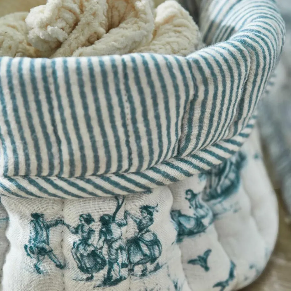 Das 2er Set Körbe verbindet klassisches Design mit funktionaler Vielseitigkeit. Der Bezug aus reiner Baumwolle ist mit einer weichen Wattierung ausgestattet, die den Körben eine einladend kuschelige Haptik verleiht. Außen ziert ein nostalgisches Toile-De-Jouy-Muster die Körbe, das durch ein Streifenmuster im Inneren harmonisch ergänzt wird. Der Rand lässt sich einfach umstülpen, wodurch die Höhe und das Erscheinungsbild der Körbe nach Belieben verändert werden können – ideal für die individuelle Gestaltung in jedem Raum. Ob für die Aufbewahrung kleiner Schätze oder als dekorativer Akzent, diese Körbe bieten stets eine charmante Lösung.