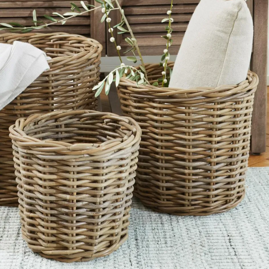 Diese drei wertvollen Körbe aus Rattan sind aufwendig von Hand geflochten. Sie sind sehr langlebig, klassisch in der Optik und kommen in drei Größen im Set zu Ihnen. Das Trio ist natürlich schön und zaubert spielend leicht Ordnung in jeden Raum. Sie könnten darin Gemüse und Obst in der Küche verwahren, im Arbeitszimmer kleinere Utensilien hineinlegen, Spielsachen darin sortieren oder am Schminktisch sowie im Bad Ihre Beauty-Schätze hineinlegen. So haben sie immer alles zur Hand und doch ordentlich verwahrt. Das geschmackvolle Set harmoniert mit vielen Wohnstilen und bringt eine angenehme Landhaus-Prise in Ihr Heim.
