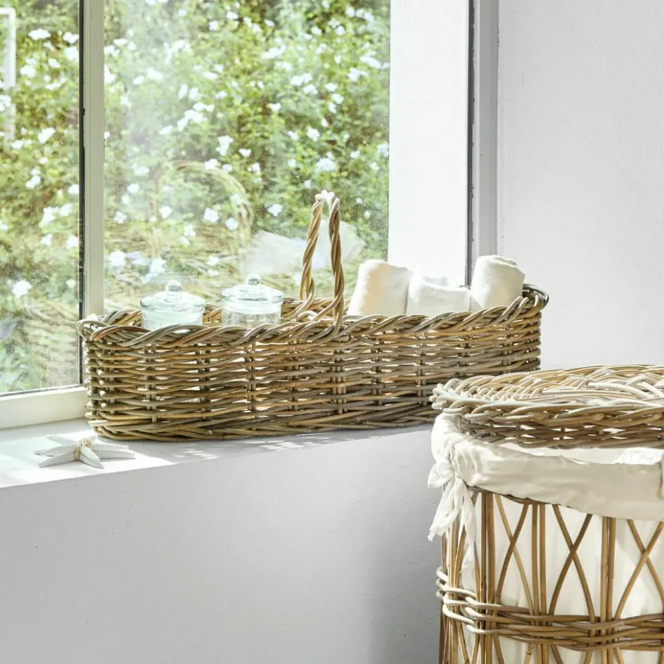 Dieser schöne Korb mit kunstvoller Flechttechnik besteht aus rein natürlichem Rattan und ist von Hand geflochten. Das schicke, schlanke Design ist sehr kreativ und vielseitig einsetzbar. Es hat zwei separierte Fächer und einen Tragegriff und könnte für Besteck, Trockenblumen, Dekorationen und vieles mehr verwendet werden. Auch Obst und Gemüse lassen sich ansprechend darin drapieren, sodass Aufbewahrung und Zierde sich charmant treffen. Hier sind Sie völlig frei in der Gestaltung und können sehr hübsche Akzente im Landhaus-Stil setzen, welche jedem Raum von Küche bis Wohnzimmer schmeicheln. Als Tischschmuck oder Deko-Highlight auf einer Anrichte wird es hiermit richtig gemütlich in Ihrem Zuhause.
