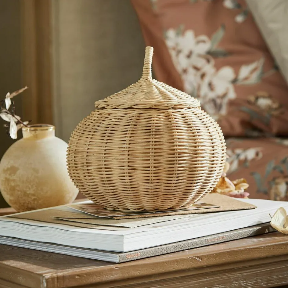 Eingebettet in die ruhige Szenerie eines stilvollen Interieurs, erzählt dieser Rattankorb in Kürbisform Geschichten von fernen Ländern und traditionellem Handwerk. Die handgeflochtenen Muster und die sanft geschwungene Form spiegeln die Präzision und Geduld wider, die in jedem Flechtknoten steckt. Die natürliche Farbgebung schafft eine Atmosphäre der Entspannung und des Wohlbehagens, die sich nahtlos in Ihre Wohnlandschaft einfügt. Jede Berührung offenbart die robuste und doch feine Struktur des Rattans und macht diesen Korb zu einem authentischen Schatz in Ihrer Sammlung von Heimaccessoires. Er ist nicht nur ein praktischer Behälter, sondern auch ein Ausdruck von Individualität und einer tieferen Wertschätzung für handwerkliche Kunst.
