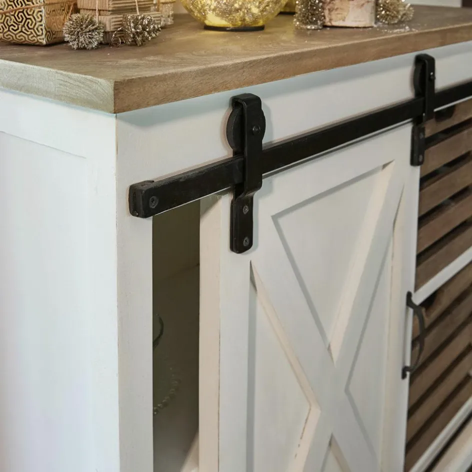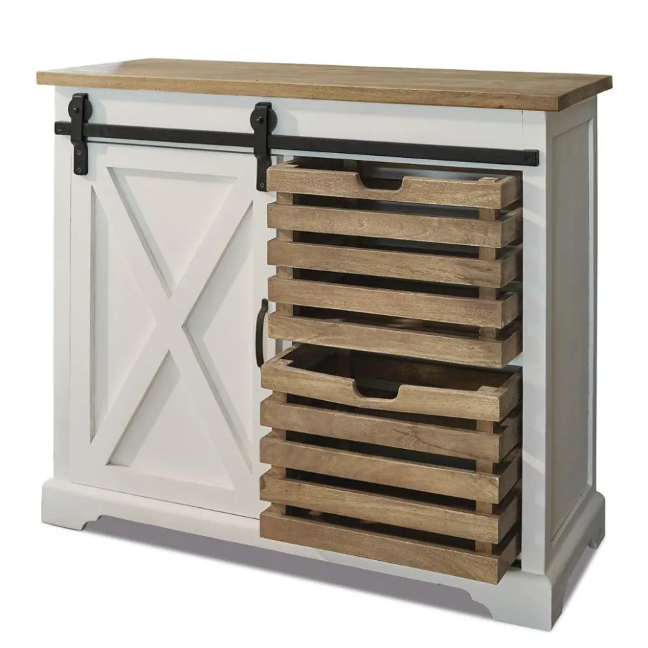 Küche oder Diele, Speisezimmer oder Wohnraum – es gibt eigentlich kaum einen Ort im Haus, an dem diese Kommode nicht platziert werden kann. Allerdings hat sie es verdient, dass ihr am künftigen Stammplatz ausreichend Beachtung geschenkt wird, denn sie ist ein kleines Meisterwerk der traditionellen Handwerkskunst. Ganz aus edlem Mangoholz gefertigt präsentiert sie sich mit den charakteristischen Stilelementen, die klassische Landhaus-Möbel auszeichnen. Doch neben den Zierleisten an der Tür und dem Bodenkranz mit hübsch gearbeiteten Füßen darf sich die Kommode auch mit etwas ausgefalleneren Elementen schmücken. So ist die Tür keine Flügeltür, die sich in kleinen Räumen oder engen Durchgängen als störend erweisen könnte, sondern eine praktische Schiebetür, die auf einer massiven Eisenführung läuft, die einen rustikalen Akzent setzt. Die herausnehmbaren Holzkörbe wiederum tragen zur nostalgischen Optik der Kommode bei, erinnern sie doch an die Obstkisten, in denen Großmutter immer die Äpfel und Birnen aus dem Garten aufbewahrte. Doch so praktisch die Kommode auf der einen Seite ist, wenn sie die verschiedensten Utensilien hinter der Tür und in den Kisten verschwinden lässt, so dekorativ wirkt sie mit dem Mix aus weißem und naturbelassenem Holz auf der anderen Seite. Außerdem eignet sie sich auch perfekt als Bühne für Ihre individuellen Deko-Ideen, mit denen Sie die Stimmung der jeweiligen Jahreszeit auch indoor unterstreichen können.