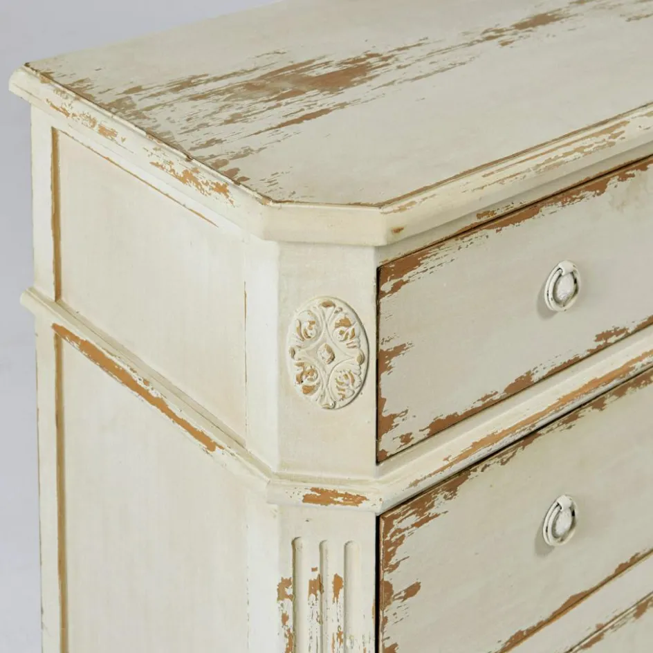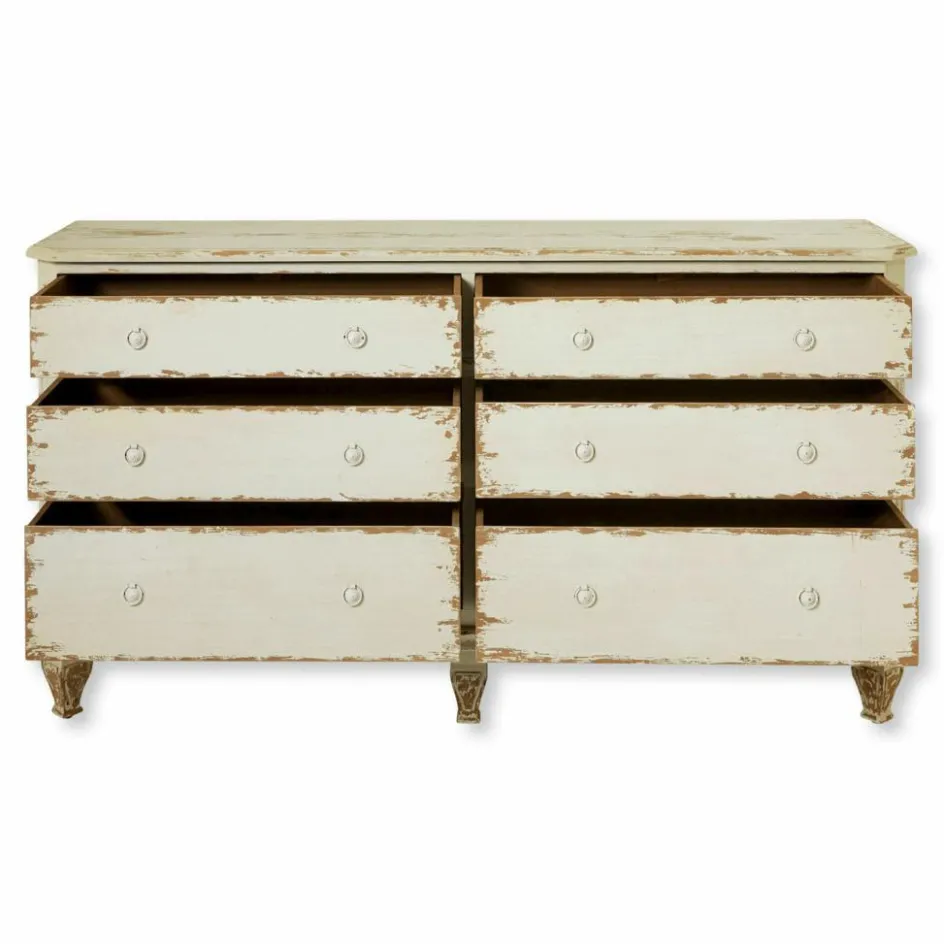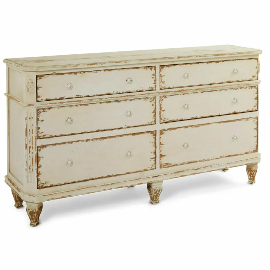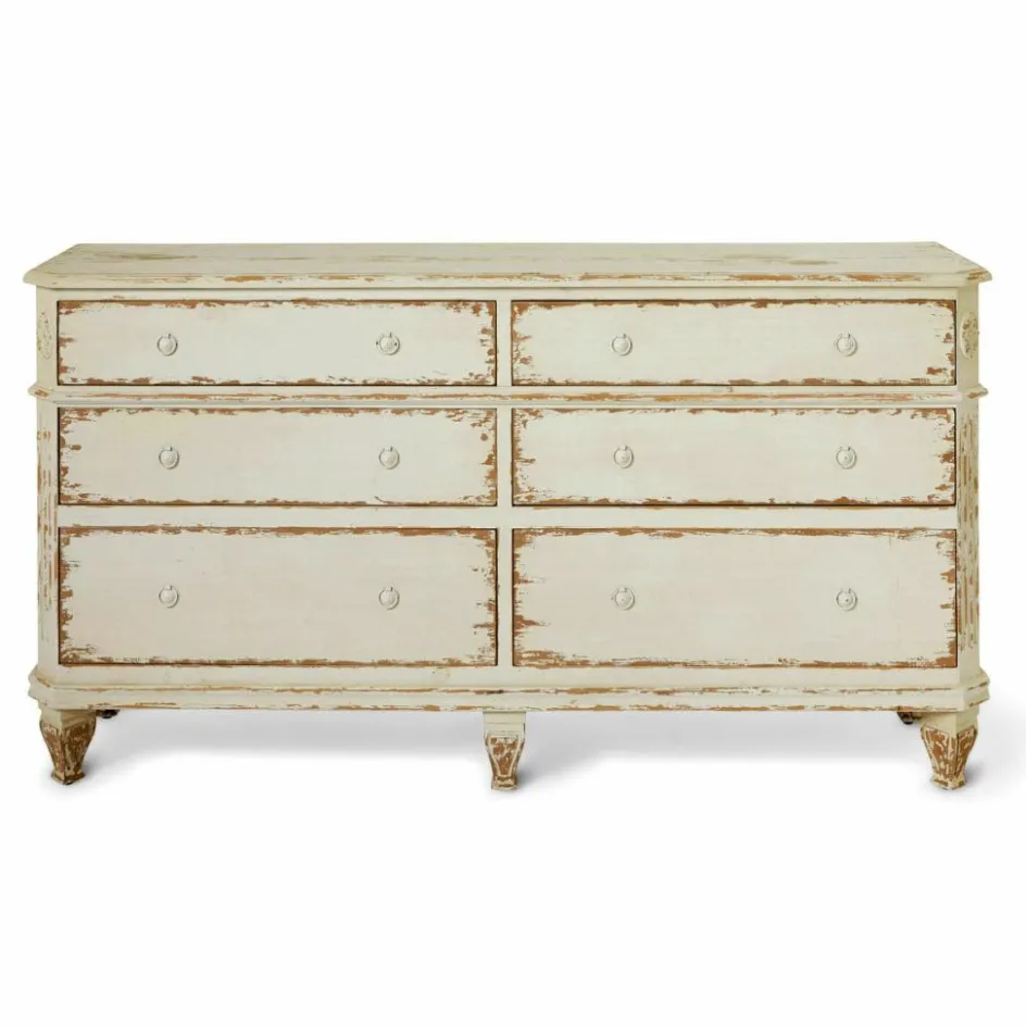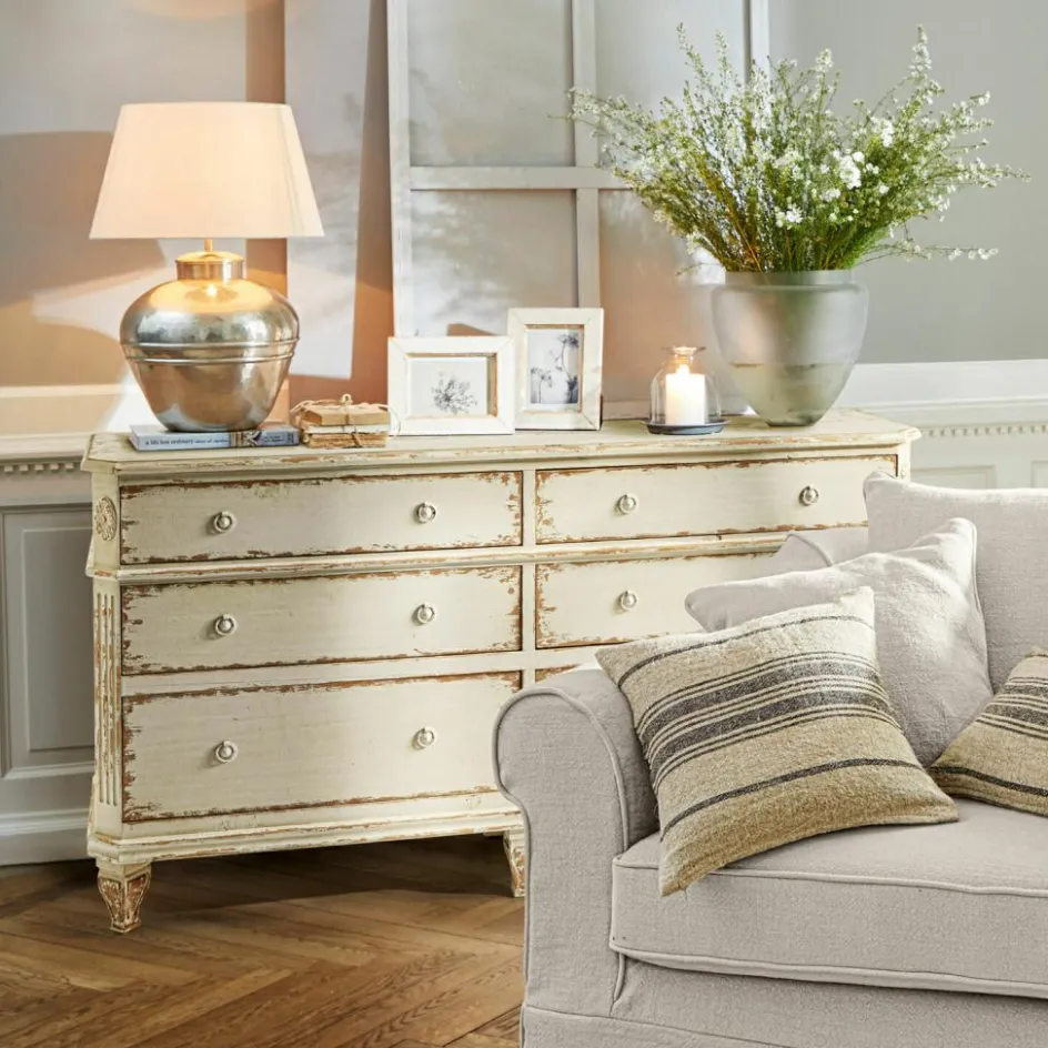 Wie ein geliebtes Erbstück aus einem Landhaus wirkt diese massive Kommode aus echtem Tannenholz. Die aufgetragenen Gebrauchsspuren verleihen dem Möbelstück ein bezauberndes historisches Flair. So als hätten die geräumigen Schubladen schon die Kleidung vieler Generationen aufbewahrt. In Zeiten, in denen das Waschen und Säubern der Wäsche noch viel Mühe machte. Man mag sich vorstellen, wie die Kleider zunächst im Kessel ausgekocht wurden und die gesamte Waschküche dabei voller Dampf und Hitze stand. Von Sonne und Wind getrocknet, warteten die wohlriechenden Wäschestücke dann in der wunderschönen Kommode geduldig auf ihren nächsten Einsatz. Dieses einzigartige Schmuckstück bringt Behaglichkeit und den Charme längst vergangener Zeiten in Ihre Wohlfühlräume!