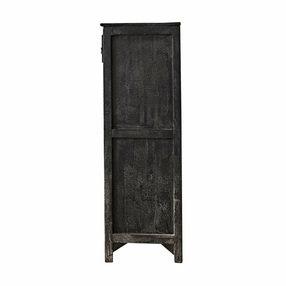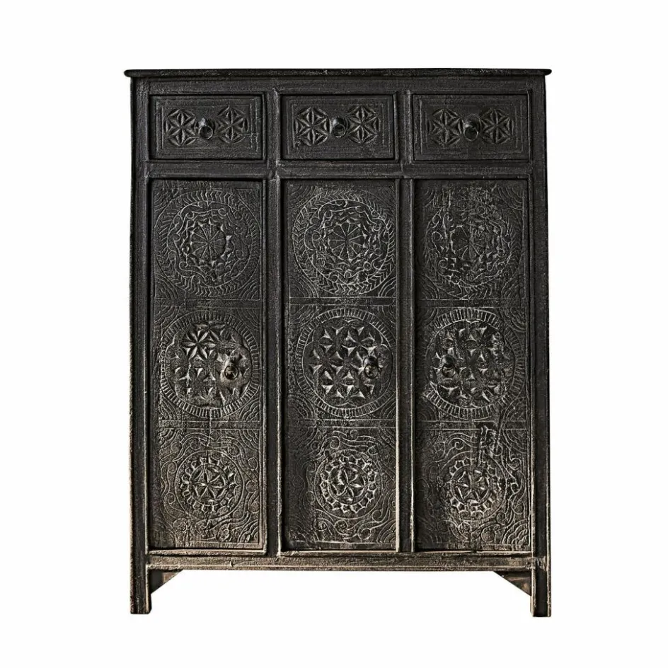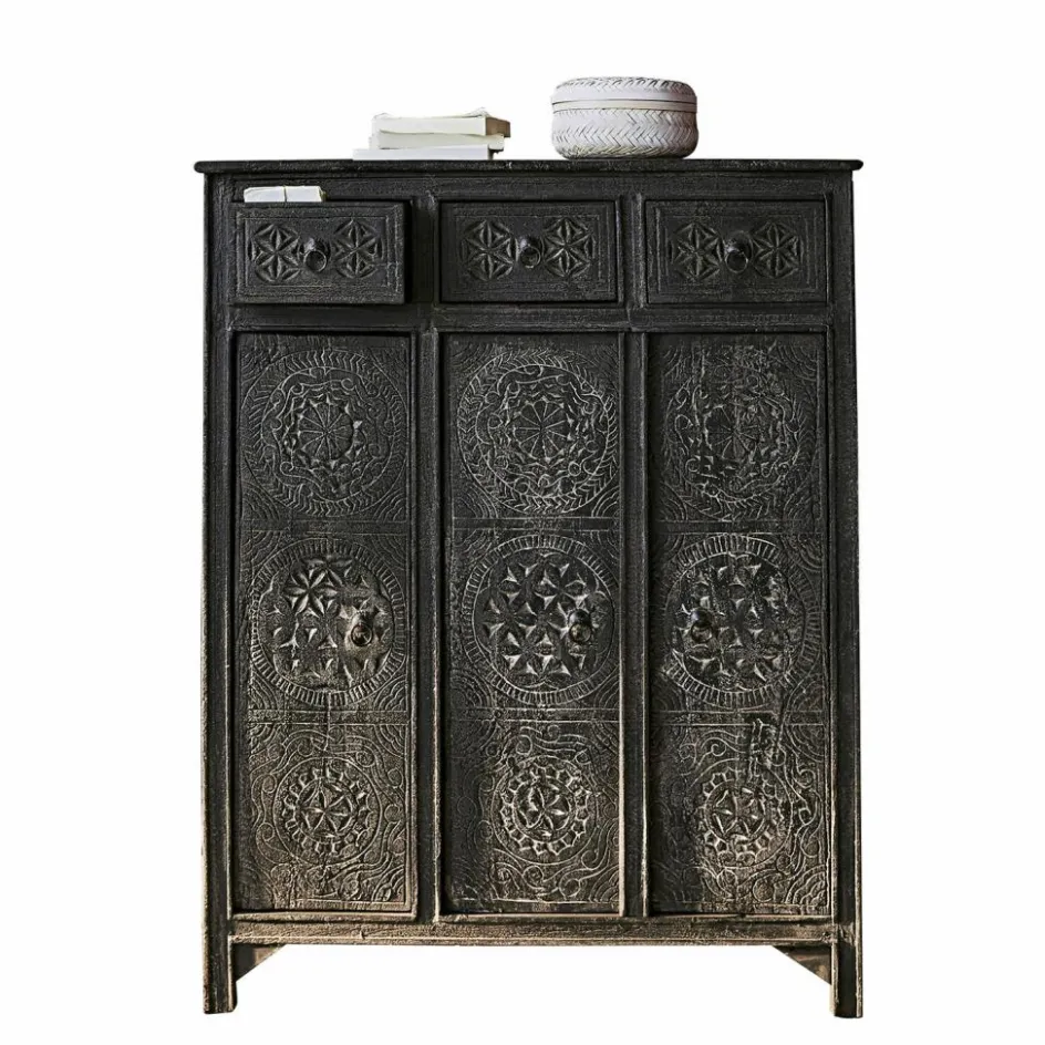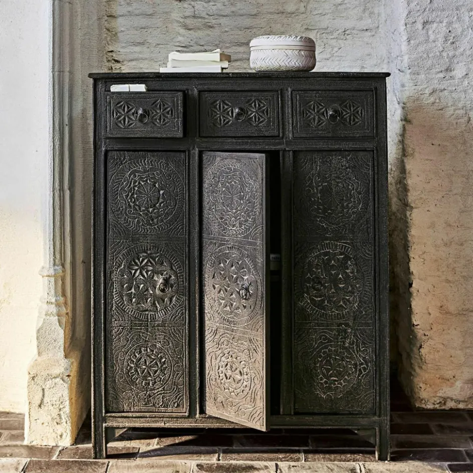 Prachtvolle Ornamente zieren die Türen und Schubladenfronten und jeder Betrachter sieht sofort: Diese Kommode ist etwas ganz Besonderes! Denn sie wurde nicht nur im traditionellen Stil von Hand gebaut, was heutzutage nicht mehr die Regel ist. Stunde um Stunde hat der Künstler geduldig von Hand die Türen und Schubladenfronten der Kommode mit kunstvollen ornamentalen Schnitzereien versehen, die von seinem handwerklichen Geschick wie von seinem ästhetischen Feingefühl zeugen. Diese Verzierungen zusammen mit dem antikschwarzen Finish machen die Kommode zu einem exklusiven Einzelstück, das jedem Ambiente den individuellen Charakter verleiht. Das Mangoholz ist ein edles, hartes Tropenholz, das bei ambitionierten Möbel-Designern sehr beliebt ist, denn als Nebenprodukt des Obstanbaus punktet es auch auf den Dimensionen Umweltfreundlichkeit und Nachhaltigkeit. Doch die Kommode überzeugt nicht nur durch ihre ästhetischen Vorzüge, sondern macht sich mit den geräumigen Fächern hinter den Türen und den drei Schubladen auch als exquisites Stauraumwunder nützlich, in dem Sie die verschiedensten Dinge unterbringen können.
