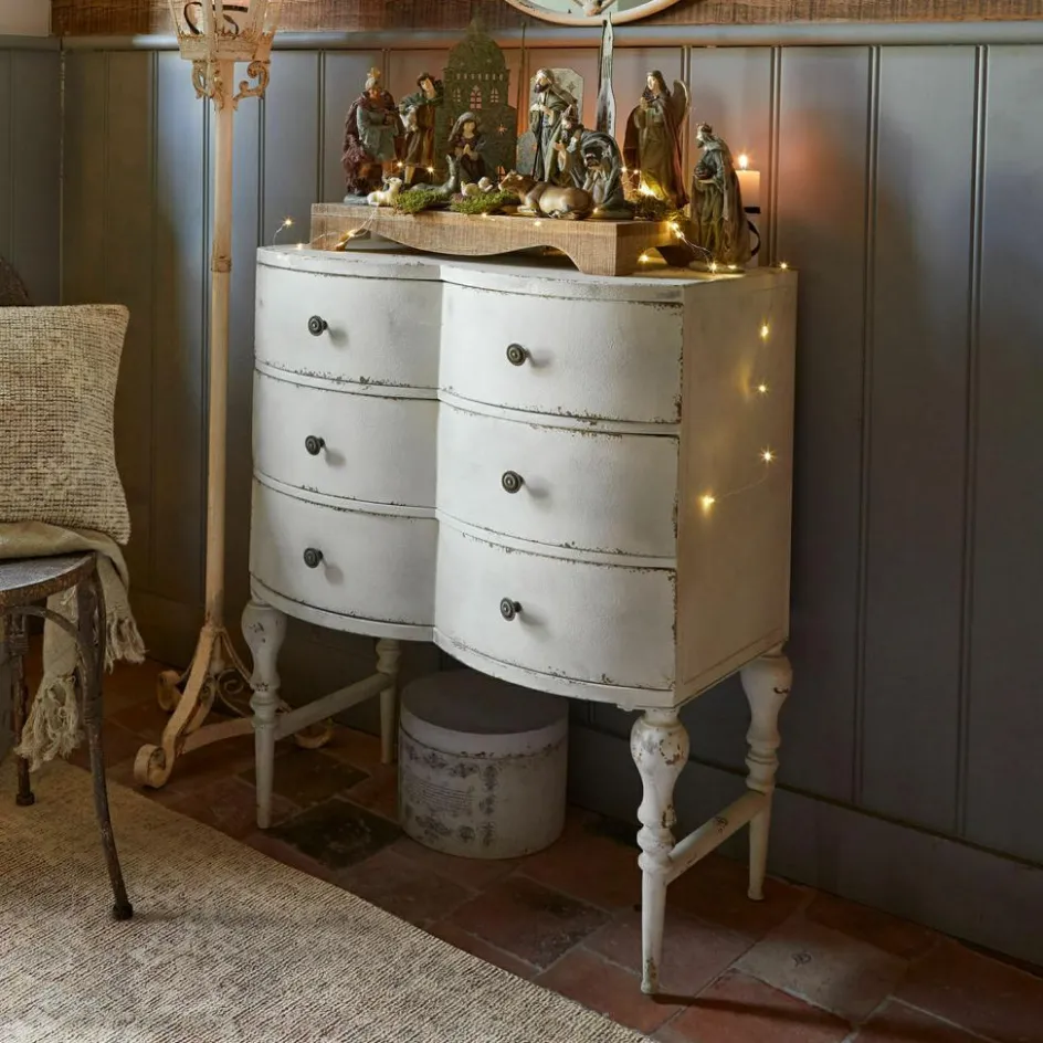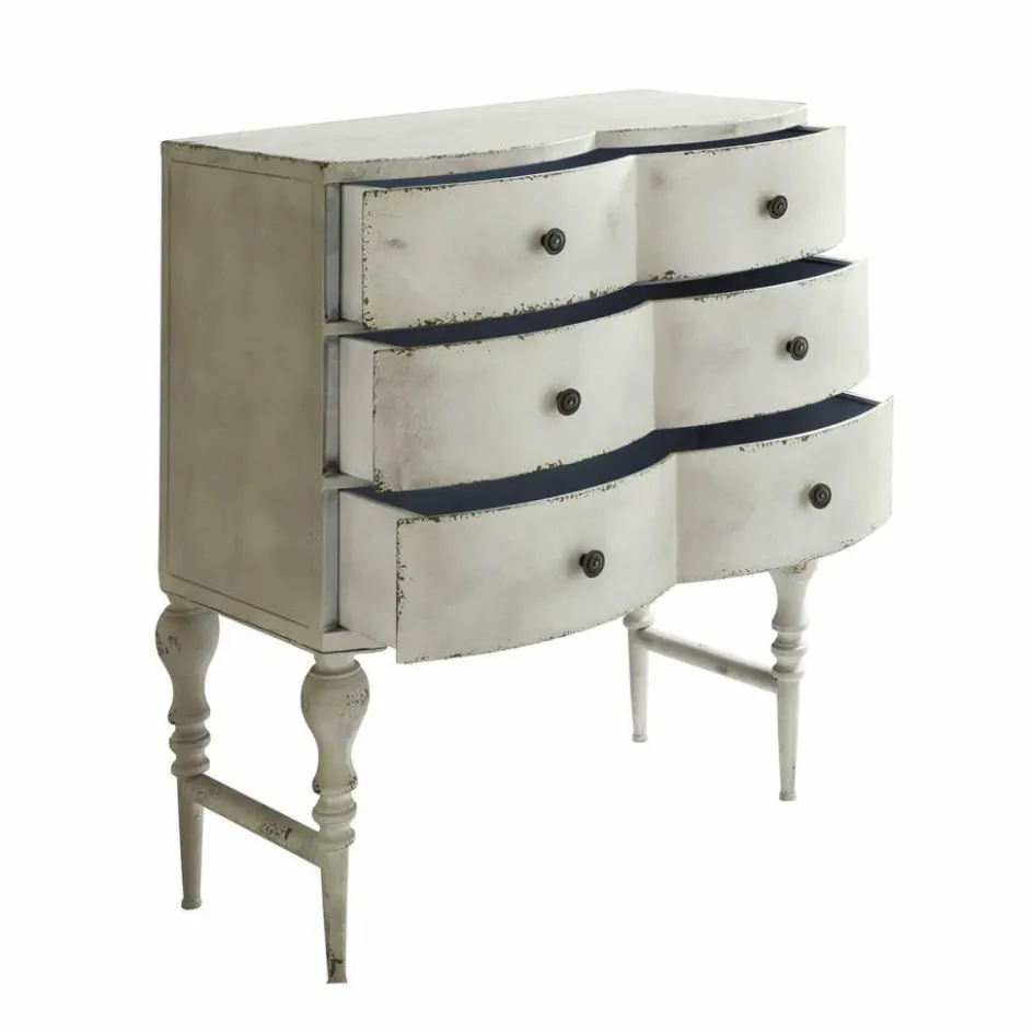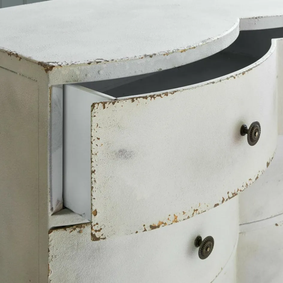 Als wäre sie aus einem romantischen Pariser Atelier entführt – so wirkt diese außergewöhnliche Kommode mit ihrer wellenförmigen Front und den zarten Abriebspuren. Gefertigt aus Eisen, versprüht sie eine kühle Robustheit, die durch das cremeweiße Antik-Finish liebevoll gebrochen wird. Die drei Schubladen fügen sich organisch in die weich geschwungene Form und bieten Platz für Ihre Schätze. Die hohen Beine und charmante Vintage-Knöpfe unterstreichen den nostalgischen Charakter – ideal für alle, die ein Statement setzen möchten, ohne auf Funktionalität zu verzichten.