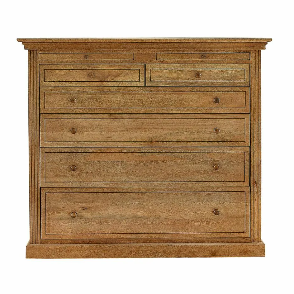 Verleihen Sie Ihrem Zuhause einen Hauch von rustikalem Charme mit dieser beeindruckenden Kommode aus massivem Mangoholz. Das dezente antikgraue Washed-Finish und die sichtbaren Holzmaserungen machen jedes Stück zu einem einzigartigen Kunstwerk der Natur. Die sorgfältig gearbeiteten Schubladen bieten reichlich Stauraum für Ihre Habseligkeiten, während die oberen beiden Auszüge eine praktische Besonderheit darstellen: Sie können als zusätzliche Ablagefläche genutzt werden oder bieten Platz für ein bequemes Schreibpult. Dieses vielseitige Möbelstück ist nicht nur funktional, sondern auch ein stilvolles Statement in jedem Raum. Ob im Wohnzimmer zur Aufbewahrung von Büchern und Dekorationen, im Schlafzimmer für Kleidung und Accessoires oder im Arbeitszimmer als stilvolle Organisationseinheit – diese Kommode fügt sich harmonisch in jede Einrichtung ein und bereichert Ihr Zuhause mit natürlicher Schönheit und praktischer Raffinesse.