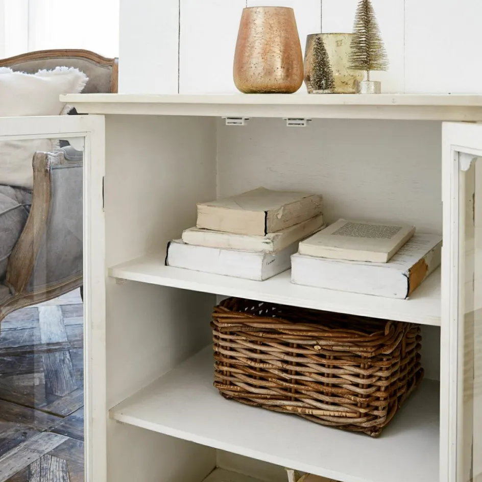 Was fasziniert uns eigentlich so an dem Einrichtungstrend, der als Shabby-Chic immer mehr Liebhaber findet? Ist es die Vorstellung, dass die Möbel mit den sichtbaren Gebrauchspuren einen ganz eigenen Charakter haben und uns Geschichten aus vergangenen Zeiten erzählen? Oder dass wir an den kleinen, aber feinen Details erkennen, dass das Möbelstück mit Sorgfalt in bester Handwerksmanier von Hand gefertigt wurde? Wenn diese Kommode vielleicht bald in Ihren vier Wänden steht und Sie auf den stabilen Regalböden hinter den Glastüren Sammlerstücke wie das Kaffeegeschirr der Großmutter oder andere geliebte Deko-Objekte arrangieren, werden auch Sie die nostalgische Ausstrahlung dieser Kommode spüren. Von den geschwungenen Glastüren mit den kunstvoll verzierten Eisengriffen bis zu dem stabilen Podest ist die Kommode ein Schmuckstück, das in jedem Raum einen Hauch Romantik verbreiten wird. Aber nicht nur die dezenten Gebrauchsspuren an den Türen der Vitrine und an den anderen Holzelementen, sondern auch der antike Farbton selbst trägt zum nostalgischen Flair der Kommode bei.
