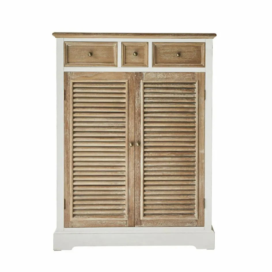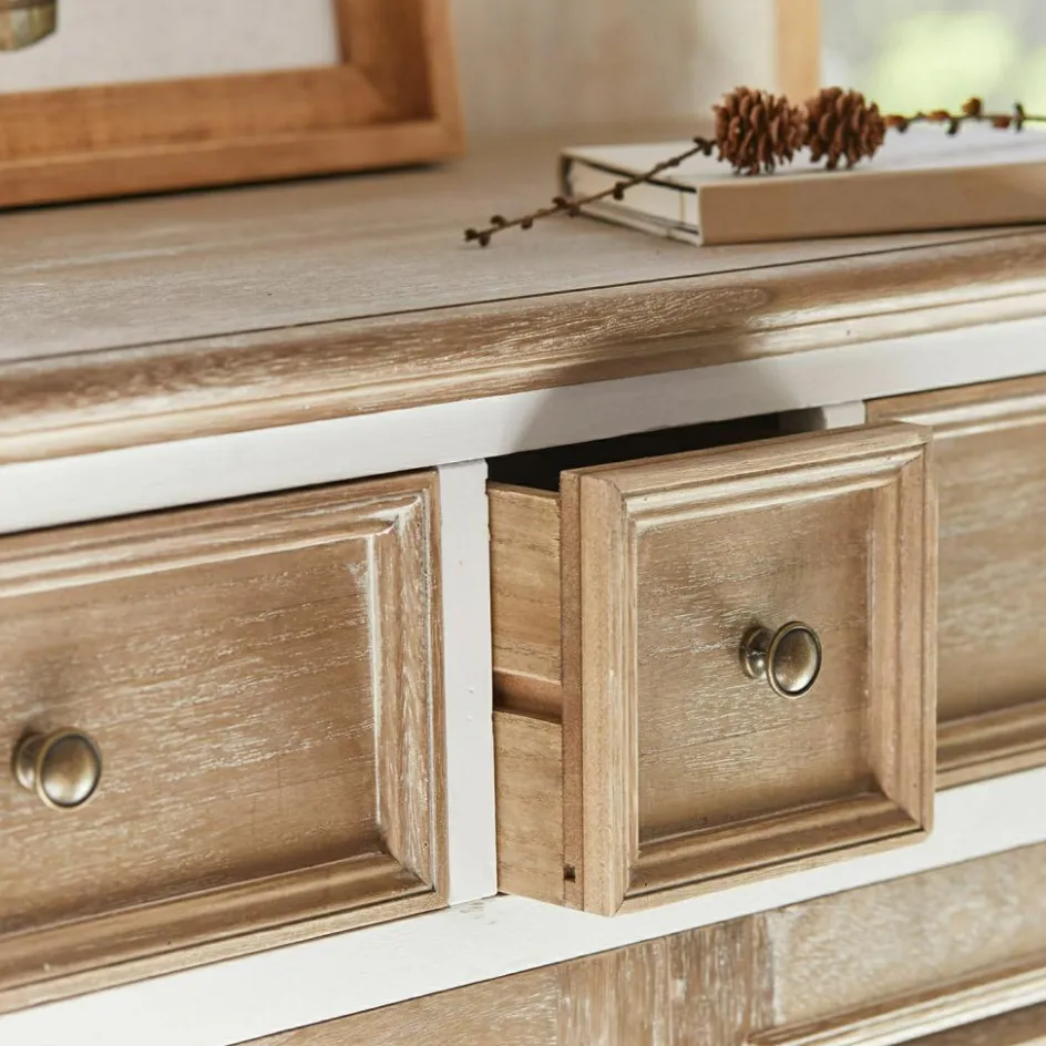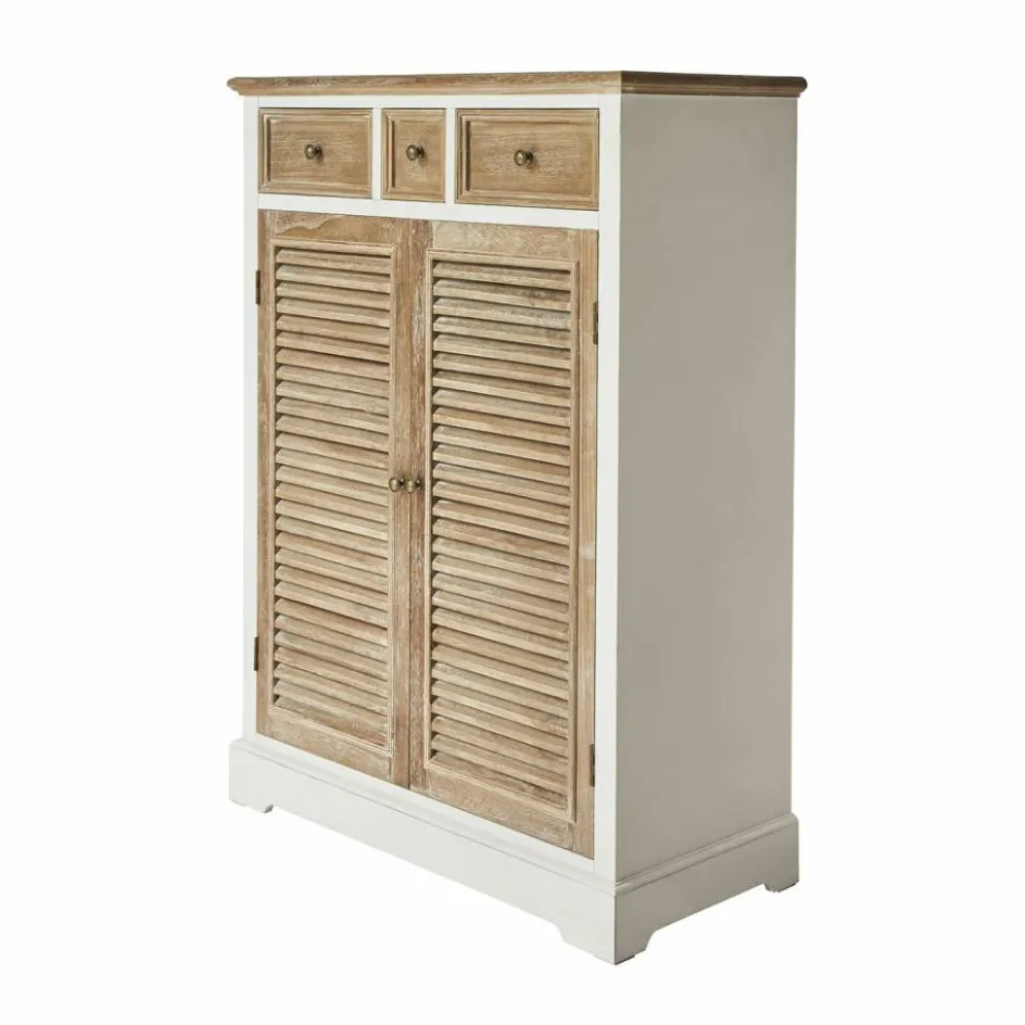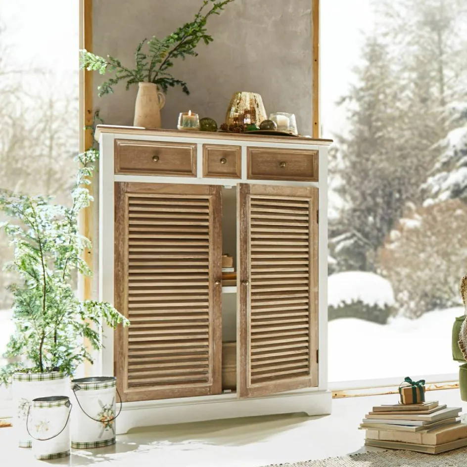 Verleihen Sie Ihrem Zuhause einen Hauch von zeitlosem Charme mit dieser handgefertigten Kommode aus massivem Kiefernholz. Die kunstvolle Kombination aus weiß lackierten Flächen und naturbelassenen Elementen mit White-Washed-Finish verleiht diesem Möbelstück eine warme und einladende Ästhetik. Hinter den beiden Türen verbirgt sich großzügiger Stauraum, der durch drei zusätzliche Schubladen ergänzt wird – perfekt für all Ihre Aufbewahrungsbedürfnisse. Jedes Detail dieser Kommode, von den rustikalen Lamellen der Türen bis hin zu den eleganten Knöpfen, spricht für Qualität und Handwerkskunst. Lassen Sie sich von der Mischung aus Funktionalität und stilvollem Design begeistern und genießen Sie die vielseitigen Einsatzmöglichkeiten dieses exquisiten Möbelstücks.