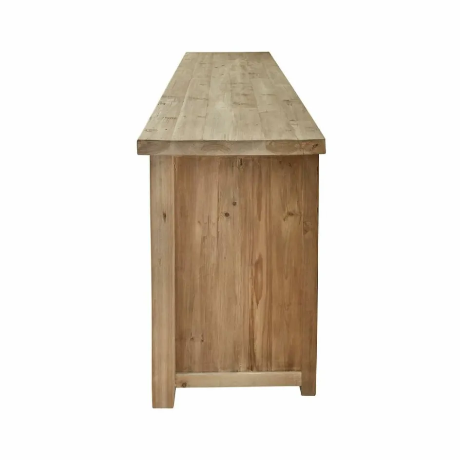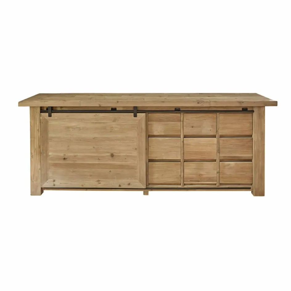 Der künstlerische Entwurf dieser Kommode offenbart die Passion des Handwerkers für den modernen Landhaus-Look. Modern, weil er sich einer schlichten, zurückhaltenden Formensprache bedient, zugleich aber auf die anheimelnde Wirkung von echtem Holz setzt. Das Holz ist gewachst, was die natürliche Maserung des Holzes zusätzlich hervorhebt. Das Ergebnis ist eine Kommode, die sich nicht nur in nahezu jedes Ambiente einfügt, sondern in diesem das Flair entspannter Wohnlichkeit verbreitet, wie man es noch heute in mediterranen Landhäusern findet. Und wie für alle Landhaus-Möbel gilt auch für diese Kommode: Gut aussehen allein reicht nicht. Deshalb bietet Ihnen die Kommode auf einer stattlichen Länge von 235 cm Stauraum satt. Im Speisezimmer finden Geschirr und Tischwäsche, aber auch Kerzen, Servietten, Deko und vieles andere darin Platz, soll die Kommode ihren zukünftigen Standort im Schlafraum haben, können Wäsche, Strümpfe und Co endlich ordentlich in die insgesamt neun Schubladen einsortiert werden, während links in den beiden Fächern hinter der Schiebetür vielleicht die Bettwäsche auf ihren nächsten Einsatz wartet. Die Schiebetür hat eine Führung aus massivem Eisen, zum Öffnen der Schubladen befinden sich eiserne Griffmulden unten an jeder Schublade. Bis auf die Rückwand aus massivem Tannenholz natürlich gemaserter Oberfläche gearbeitet.
