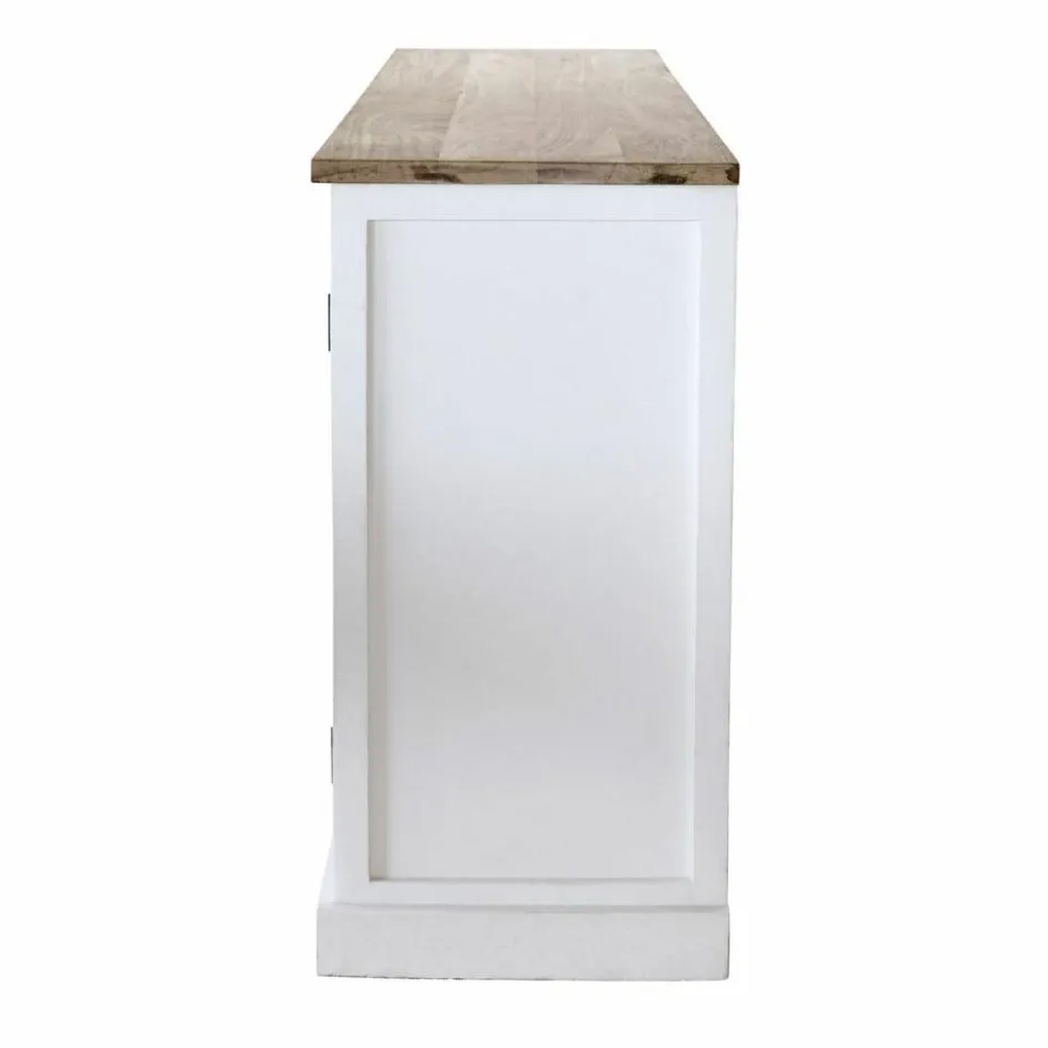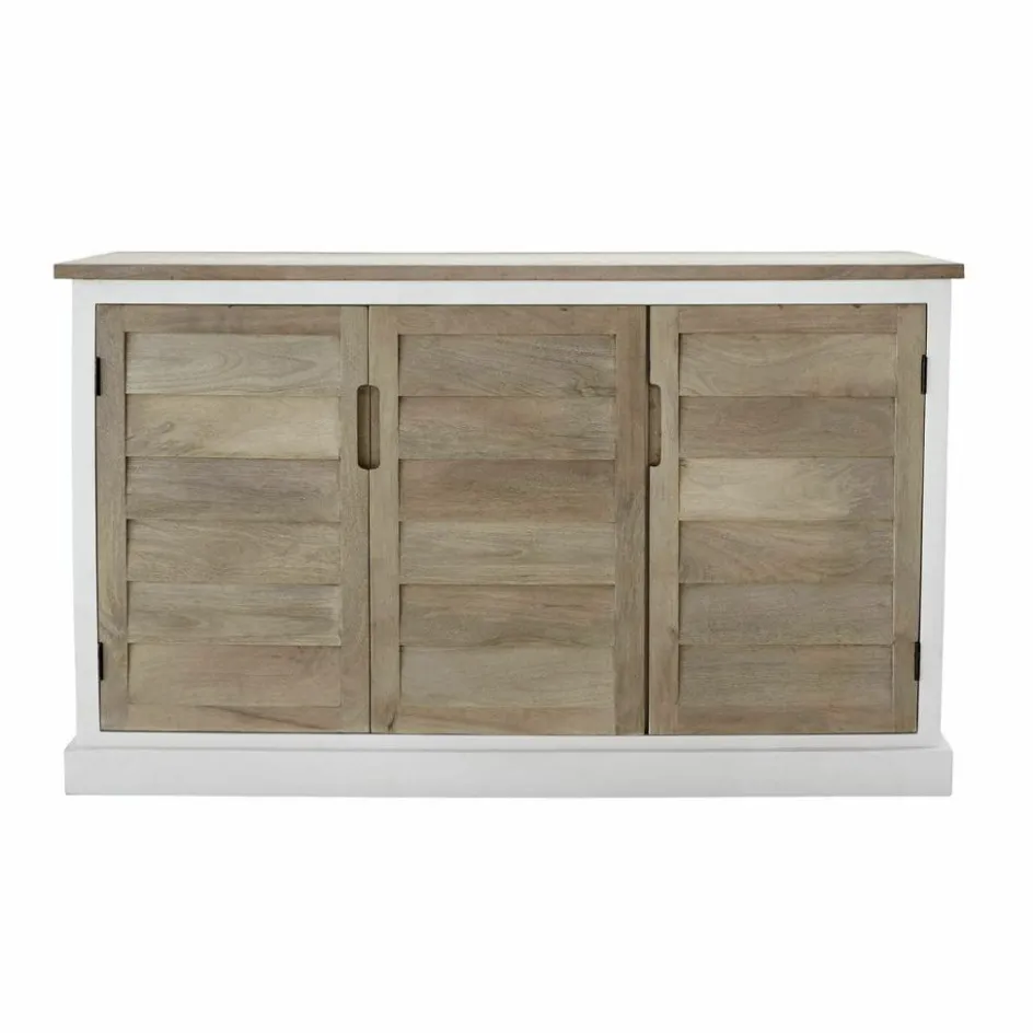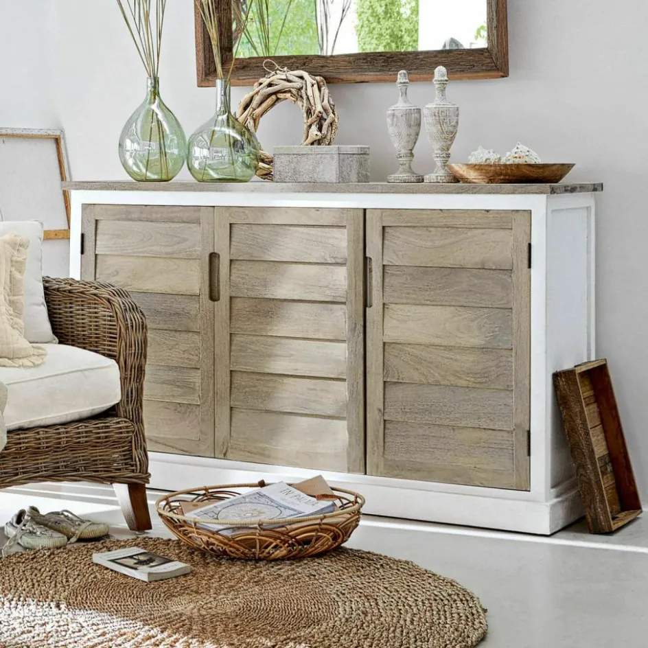 Mit der klassischen Lamellen-Optik an den Türen lässt uns die Kommode von entspannten Sommertagen in der Provence träumen, mit dem schlichten Korpus und der frischen Zweifarbigkeit aus naturbelassenem und weiß lackiertem Holz kann die Kommode aber auch frischen Wind in ein Haus auf Long-Island bringen oder in einem Appartement hoch über den Dächern einer Großstadt das unnachahmliche Flair von Ruhe und Naturverbundenheit verbreiten, das Möbel im Landhaus-Stil auszeichnet. Die Kommode wurde in bester Handwerksqualität aus edlem Mangoholz gefertigt und bietet hinter den beiden Türen mehr Stauraum, als man im ersten Moment sieht. Denn neben den vier Innenfächern befinden sich dort auch drei Schubladen, in denen Sie die verschiedensten Dinge unterbringen können. Auch in puncto Standort ist die Kommode offen für Ihre Wünsche und macht sich sowohl im Wohn- wie im Esszimmer gut, aufgrund ihrer geringen Tiefe kann sie aber auch im Schlafraum oder im Entrée platziert werden. Stiltypisches Detail sind die Griffmulden an den Türen und den Schubladen.