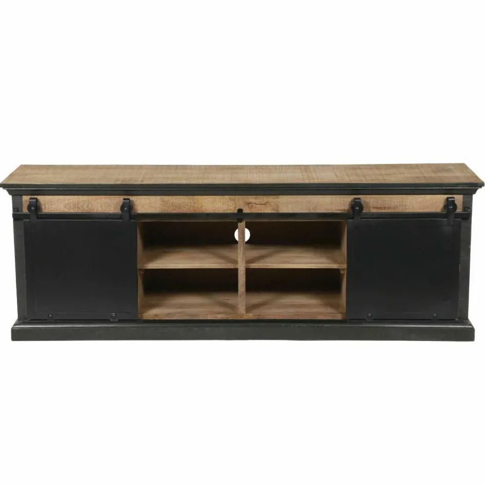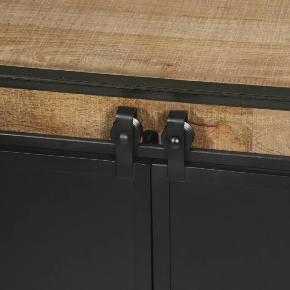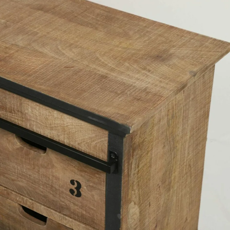 Diese einzigartige Kommode bringt typischen Industrie-Charme in Ihre Wohnwelt. Alte Fabrikmöbel aus den 20er bis 50er Jahren dienten als Vorbild für die Herstellung dieses Möbelstücks. Schwere, gegensätzliche Materialien und spannende Used-Effekte zeichnen den beliebten Trend aus, der gelebte Geschichten auf eindrucksvolle Weise widerspiegelt. Dabei werden handwerkliche Perfektion und der praktische Aspekt nicht außer Acht gelassen. Der Korpus und die Front sind aus massivem Mangoholz gefertigt, während die Rückseite und die Schubladenböden mit strapazierfähiger Holzfaserplatte ausgestattet sind. An den Kanten befinden sich dezente Farbakzente, die zusätzlichen Charme versprühen. Die vier Schubladen sind stilgerecht mit offenen Handgriffen und einem originellen Ziffernaufdruck versehen – groß genug bieten sie ausreichend Stauraum für Tischwäsche und sonstige Wohnaccessoires. Veredelt wird das nostalgisch inspirierte Stück mit zwei variablen Schiebetüren aus Eisen, die von einer Eisenstange geführt werden. Hinter den Türen verbirgt sich jeweils ein Einlegeboden, der für zusätzliche Abstellfläche sorgt. Ein auffallend schönes Möbel, das ganz viel Flair verbreitet.