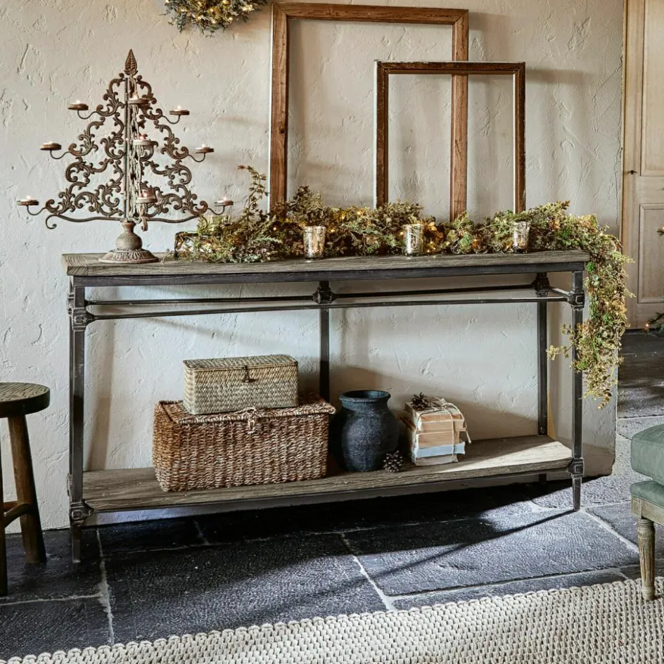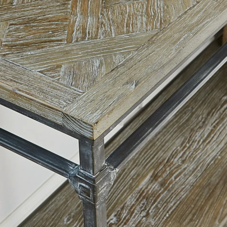 Ein elegantes und sehr individuelles Möbelstück mit viel Design-Flair. Ein besonderes Detail sind die Intarsien im oberen Teil, die an edles Fischgrät-Parkett erinnern. Es handelt sich um hochwertiges Ulmenholz. Im charmanten Materialmix mit Eisen entstand so ein ganz besonderer Look. Die Eisen-Elemente weisen ein geschmackvolles raues Finish in einem edlen Farbton auf. Klare Linien und eine feine antike Anmutung machen seinen Charme aus. Ideal im Wohnzimmer, um etwa eine Stehlampe, Bildbände und Windlichter darauf zu arrangieren. Auf der unteren Ablage könnte auch ein großer Korb mit gemütlichen Wohndecken und Kissen darin Platz finden. Alternativ können Sie das Modell im Flur oder im Schlafraum nutzen. Vielleicht auch, um Bücher oder Zeitschriften darin zu stapeln. Sogar Bad und Küche sowie ein Arbeitszimmer profitieren davon. Je nach Raum lassen sich hier Bad- oder Küchenutensilien, Make-up oder was auch immer ein hübsches Plätzchen in Ihrem Zuhause sucht, präsentieren. Zeigen Sie einen sehr raffinierten Interior-Geschmack. Ideal zu allen Wohnstilen, von Loft über antik bis hin zu Shabby-Chic und Landhaus-Stil.
