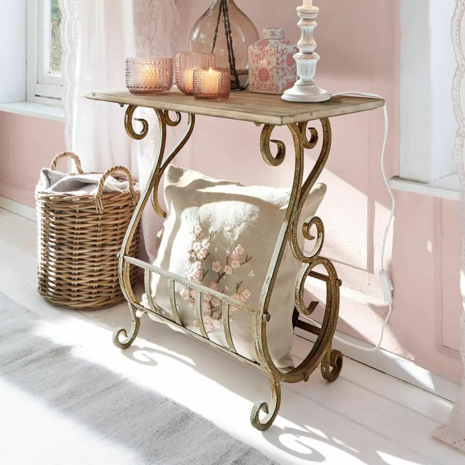 Diese Konsole erzählt eine ganz besondere Geschichte, denn das Design orientiert sich an antiken Nähmaschinentischen. Leider findet man diese ja kaum noch in den Haushalten, aber in diesem hochwertigen Konsolentisch lebt das charakteristische Design weiter. Das Gestell besteht ganz traditionell aus Eisen und schmeichelt dem Auge mit seiner kunstreichen Gestaltung. Die Platte aus natürlich schönem Tannenholz bildet einen charmanten Kontrast zum Eisengestell. Im Fußbereich findet sich eine hübsche Ablage, die vielfältige Möglichkeiten bietet. Darin können Sie verschiedenste Utensilien verstauen oder Ihre Zeitschriften ablegen. So ist die Konsole besonders im Wohn- oder Arbeitszimmer eine gute Idee. Zumal sie auch mit Ihrer gerignen Höhe kaum Platz wegnimmt.