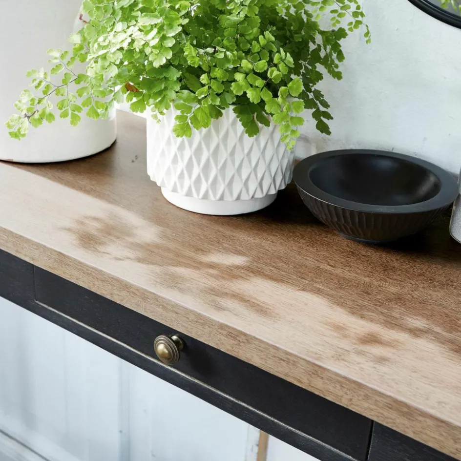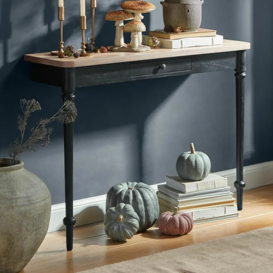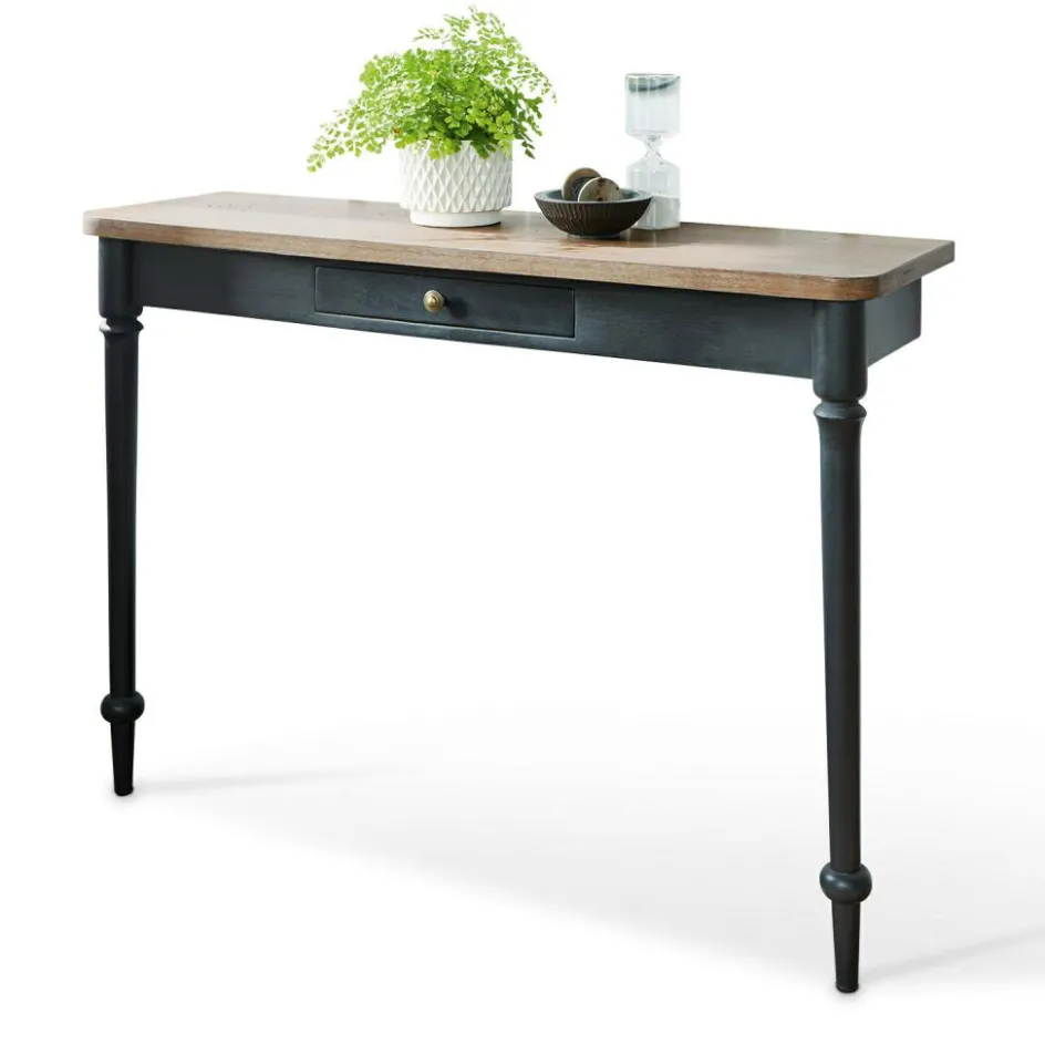 Noblesse oblige. Diesem Grundsatz zeigt sich auch diese Konsole verpflichtet und wird sich mit ihrem eleganten Äußeren wie mit ihren praktischen Fähigkeiten nützlich machen. Am besten kann sie ihre Vorzüge in kleinen Räumen, schmalen Korridoren oder in Durchgängen ausspielen, denn mit der geringen Tiefe ist sie in der Lage, sich eng an die Wand zu schmiegen und dabei nur wenig Raum zu beanspruchen, gleichzeitig bietet sie auf ihrer Platte vielen nützlichen und dekorativen Objekten einen stilvollen Platz. Wie ihre historischen Vorbilder, die seit dem 17. Jahrhundert die aristokratischen Salons Frankreichs und Italiens eroberten, wird auch diese Konsole im Handumdrehen einen festen Platz in Ihrem Wohnambiente einnehmen und Sie werden sich nicht vorstellen können, jemals auf sie zu verzichten. Klassisch und damit zeitlos schön erweist sich die Kombination aus edlem Mangoholz und handwerklich perfekter Verarbeitung, von der auch die fein gedrechselten, sich elegant verjüngenden Beine zeugen, die dem Möbelstück die zierliche Eleganz verleihen. Abgerundet wird der noble Auftritt durch die aparte Zweifarbigkeit der Kreation, bei der das dunkle Antik-Finish der Beine den warmen Naturholzton der Platte besonders schön zur Geltung bringt. Praktisches i-Tüpfelchen ist die geräumige Schublade, die sich über die gesamte Breite erstreckt und in der Sie viele Dinge griffbereit verstauen können.