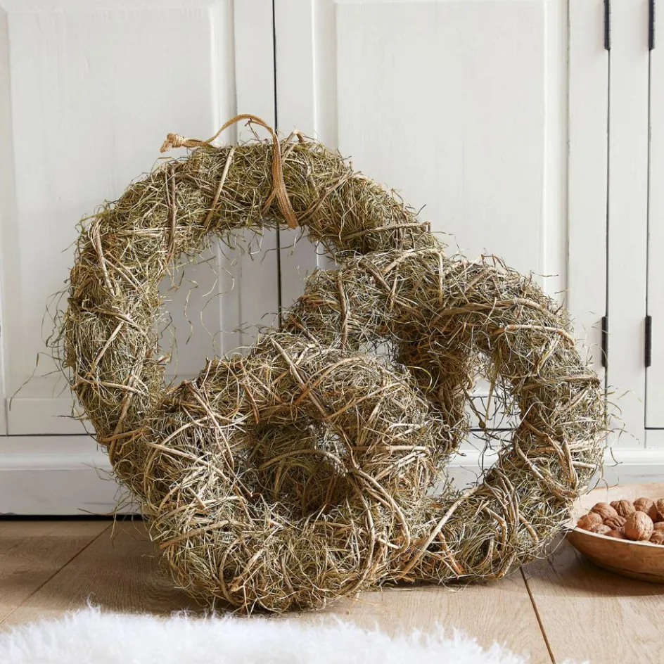 Dieses charmante Kranz-Set aus drei Größen ist sorgfältig handgebunden aus natürlichem Gras und robusten Haselnusszweigen, was ihm ein authentisches, rustikales Aussehen verleiht. Diese Kränze sind eine wunderbare Ergänzung für jede Jahreszeit, egal ob frühlingshaft frisch mit Blumen geschmückt oder winterlich mit kleinen Lichterketten verziert. Die Vielseitigkeit dieser Stücke ermöglicht es Ihnen, sie nach Belieben anzupassen und zu jeder Jahreszeit neu zu gestalten. Mit Durchmessern von 50, 40 und 30 Zentimetern passt jedes Stück perfekt in verschiedene Umgebungen und bietet zahlreiche Dekorationsmöglichkeiten.