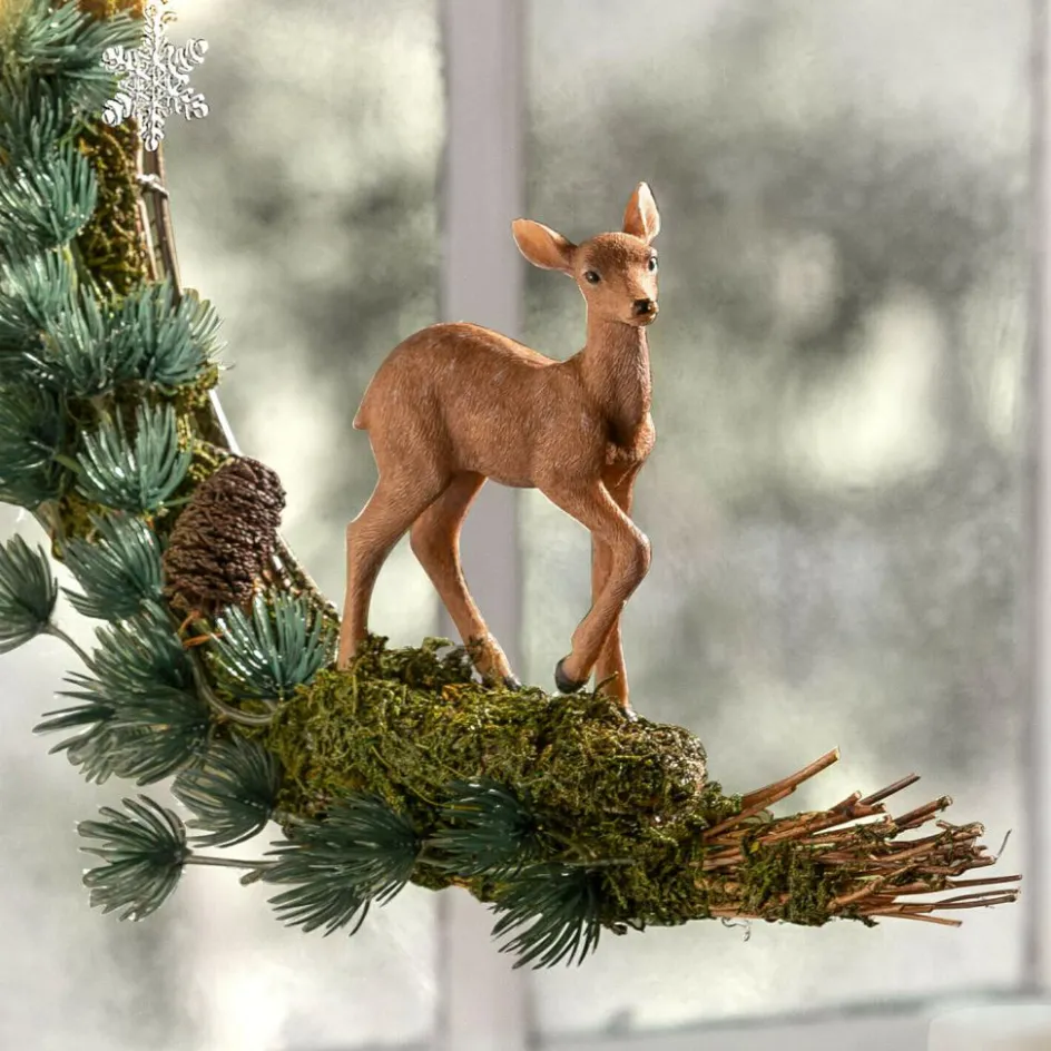 Ein Spaziergang durch den winterlichen Wald – eingefangen in einem einzigen Dekostück. Diese Hängedeko in Halbmondform besteht aus einem soliden Eisenrahmen mit integriertem Aufhängering. Um diesen schmiegt sich locker geflochtenes Rattan, das die Basis bildet für ein detailreich gestaltetes Arrangement aus künstlichem Tannengrün, sowie echten Zapfen und Moos. Im Mittelpunkt steht ein zartes Rehkitz, das wie aus einem Märchen entsprungen wirkt. Die harmonische Komposition vereint rustikale Natürlichkeit mit einem Hauch von Wintermagie – perfekt, um Eingangsbereiche, Fenster oder Wände in eine behagliche Szenerie zu tauchen.