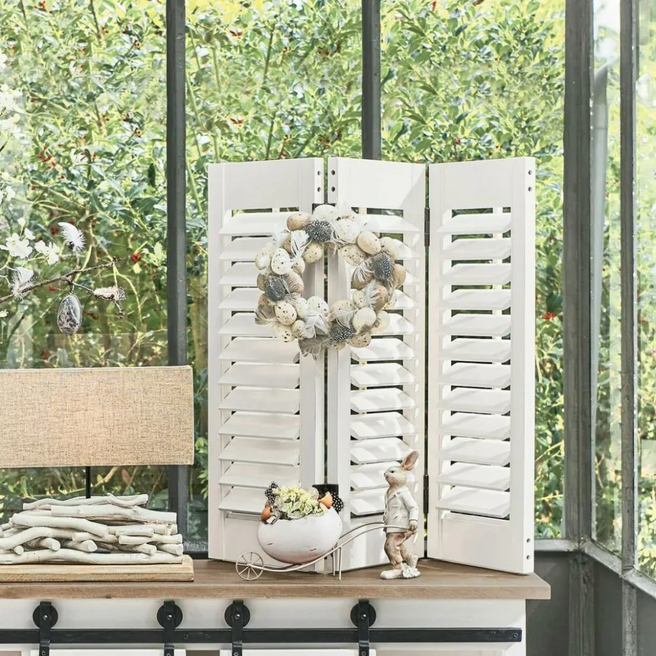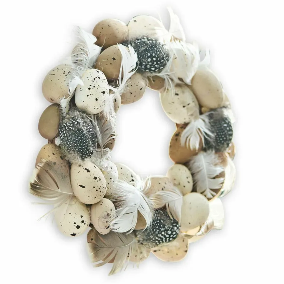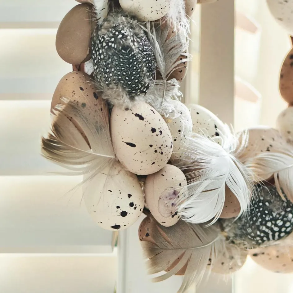 Dieser attraktive Osterkranz kombiniert bezaubernde Naturfedern mit hochwertigen Repliken, die echten Eiern täuschend ähnlich sehen. Die Eier erinnern optisch an süße, kleine Wachteleier mit unterschiedlichen Farbsprenkeln. Die rundum verteilten Hühnerfedern passen so einfach perfekt dazu und ergänzen auf die Weise einen wunderschönen Osterkranz. Das handgearbeitete Schmuckstück ist die perfekte Frühlingsdekoration für Türen, Wände und Fenster. Die Eier sind nicht bunt bemalt, sondern in einer naturbelassenen Optik gehalten. Dadurch wirkt der Kranz sehr dezent, stilvoll und unaufdringlich. Er fügt sich also nahtlos in bereits bestehende Oster-Dekorationen ein, ohne anderen Accessoires die Show stehlen zu wollen.
