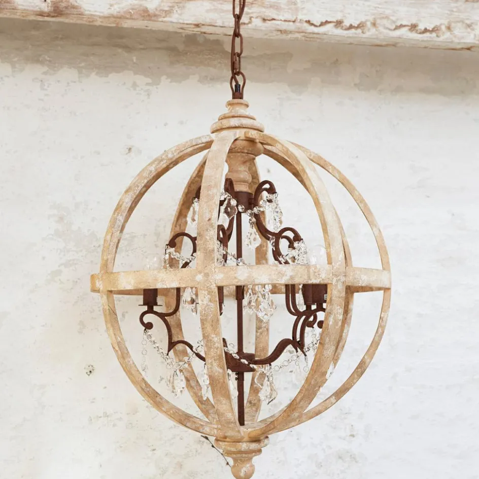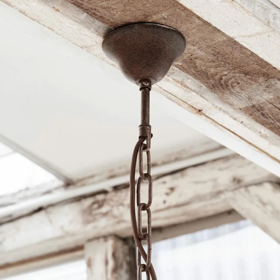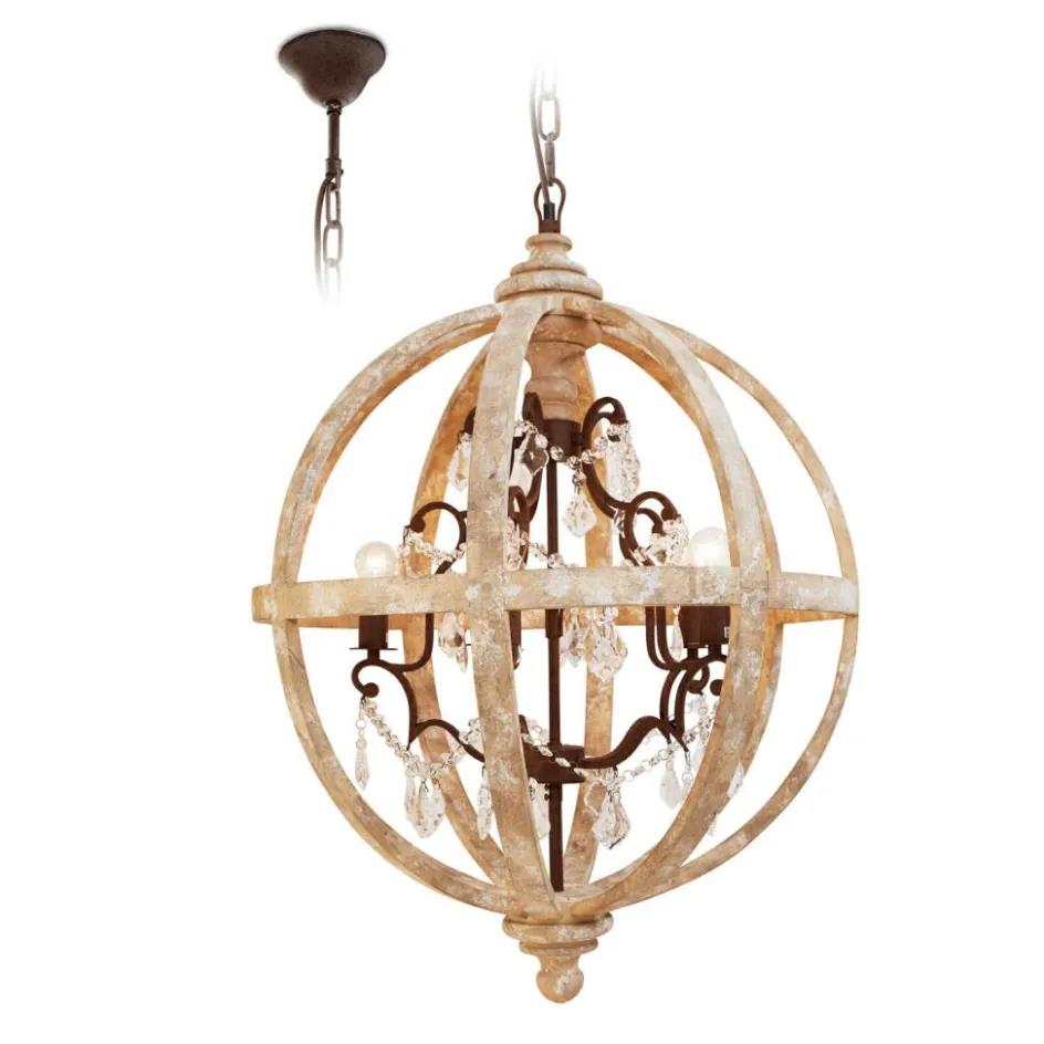 In einem verführerischen Material- und Stilmix umgibt sich diese faszinierende Hängelampe: Von außen in rustikaler Schönheit und aus Holz gestaltet, von innen im Stil eines klassischen Lüsters aus Eisen mit zahlreichen Glasprismen bestückt. Da werden Ihre Gäste staunen und bestimmt zweimal hinschauen, wenn die Hängelampe in Ihrem Ambiente für den großen Auftritt sorgt. Der sechsarmige Lüster aus Eisen funkelt von innen heraus. Dafür sorgen die fein geschliffenen Glasprismen und -ketten. Das äußere Ringgestell ist aus natürlichem Eukalyptusholz und bildet zu den Elementen aus Klarglas einen hübschen Kontrast. Der innere Eisenlüster ist wunderbar verschnörkelt. Für den Country- und Shabby Chic ist die beeindruckende Hängelampe ein Hingucker und bringt zudem ein rustikales Flair in Ihre Wohnräume. Dazu ist stilecht der Holzrahmen mit einem antikbraunen Finish veredelt worden.