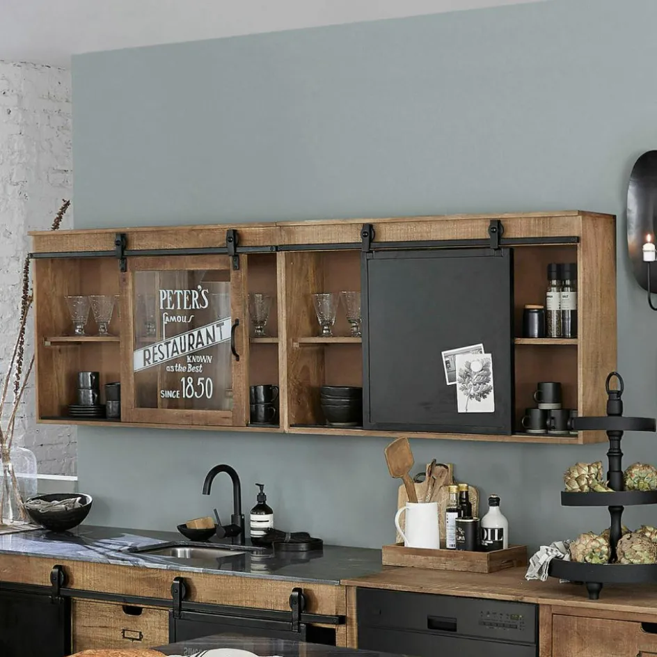 Sie sind gerade dabei, Ihre neue Küche einzurichten und haben sich für ein Design aus hochwertigem Mangoholz mit sägerauer Oberfläche entschieden, das Anklänge an den angesagten Industrial-Look zeigt und doch dank des vielen Holzes angenehm wohnlich wirkt? Dann können Sie mit diesem Hängeschrank im 2er Set den stylischen Look perfekt machen. Das Set besteht aus zwei verschiedenen Schränken – jeder mit einem individuellen Design – die aber wunderbar miteinander harmonieren. Der eine Hängeschrank ist mit einer stabilen Schiebetür aus Eisen ausgestattet, die Sie leicht hin und her bewegen können, um zum Beispiel rechts die Teller und links die Gläser herauszuholen. Bei dem anderen Hängeschrank lockt natürlich sofort die Glastür mit dem Vintage-Print die neugierigen Blicke und wird in Ihrer Küche die Atmosphäre eines angesagten Szene-Restaurants entstehen lassen. Eine Atmosphäre, die sicherlich inspirierend wirkt. Selbstverständlich können Sie jeden Hängeschrank an verschiedene Wände Ihrer Küche hängen, als langgestreckte Front nebeneinander wirken sie aber besonders trendy. Vorrichtungen zur stabilen Wandbefestigung sind auf der Rückseite bereits vorgesehen. Der Hängeschrank im 2er Set passt perfekt zu den Küchenmodulen (21163, 21184, 21164, 21165, 21166), die es auch zusammen im 5er Set gibt (21186). Natürlich sind die Hängeschränke auch einzeln erhältlich (21167, 21185).