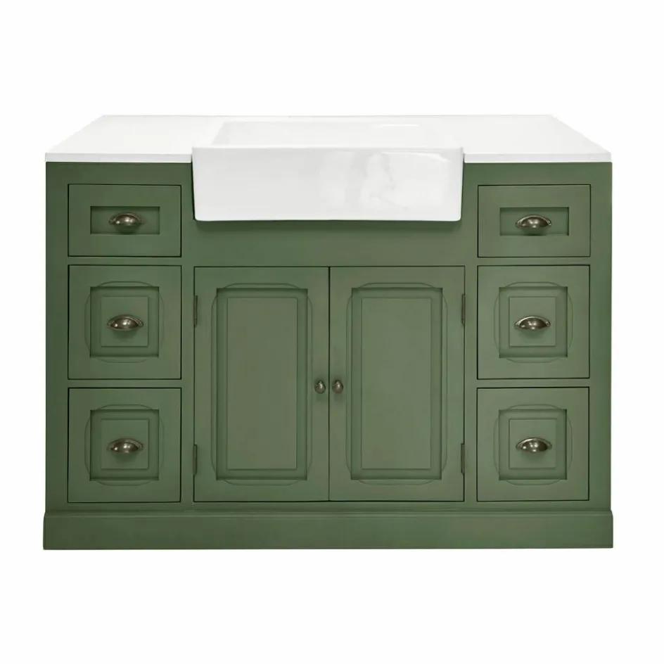 Eine Küche, die Wärme und Charakter ausstrahlt: Dieses vielseitige Küchen-Set kombiniert traditionelle Landhaus-Ästhetik mit modernen Ansprüchen an Qualität und Funktionalität. Die grüne Lackierung verleiht dem Ensemble eine natürliche, beruhigende Note, während die Quarzstein-Arbeitsplatte durch ihre feine Struktur und Robustheit überzeugt. Der großzügige Spülenschrank mit seinem klassischen Keramikbecken bringt nostalgischen Charme in Ihre Küche, ergänzt durch zwei flexibel einsetzbare Schränke, die reichlich Stauraum für Geschirr, Kochutensilien und Vorräte bieten. Das elegante Aufsatzregal setzt dekorative Akzente und eignet sich perfekt für Geschirr, Gewürze oder persönliche Lieblingsstücke. Ob als kompakte Einheit oder individuell arrangiert – diese Küche passt sich Ihren Bedürfnissen an und lässt sich mit zusätzlichen Elementen stilvoll erweitern.