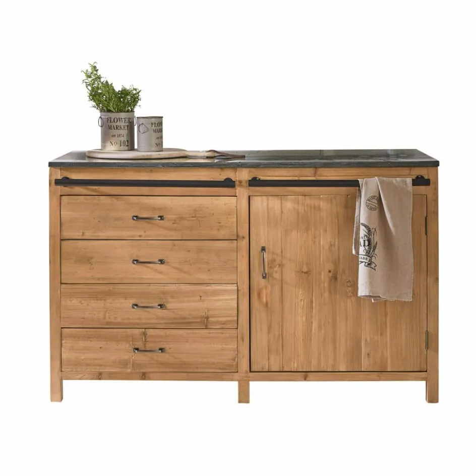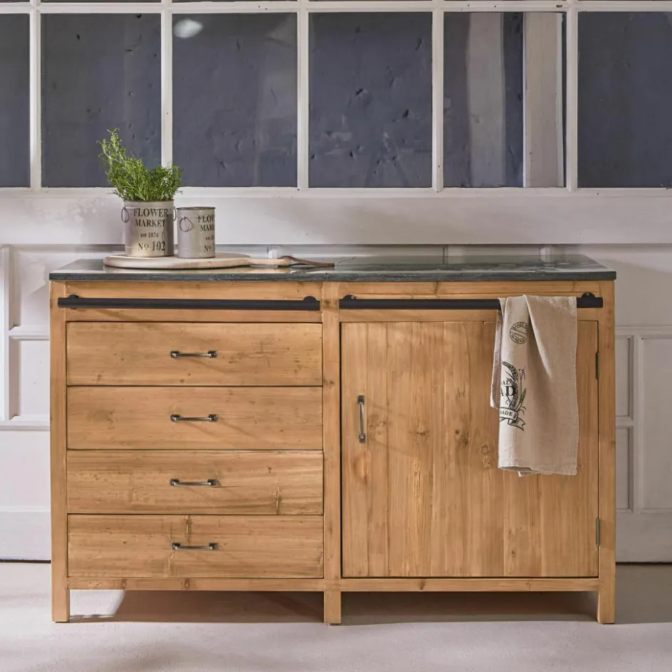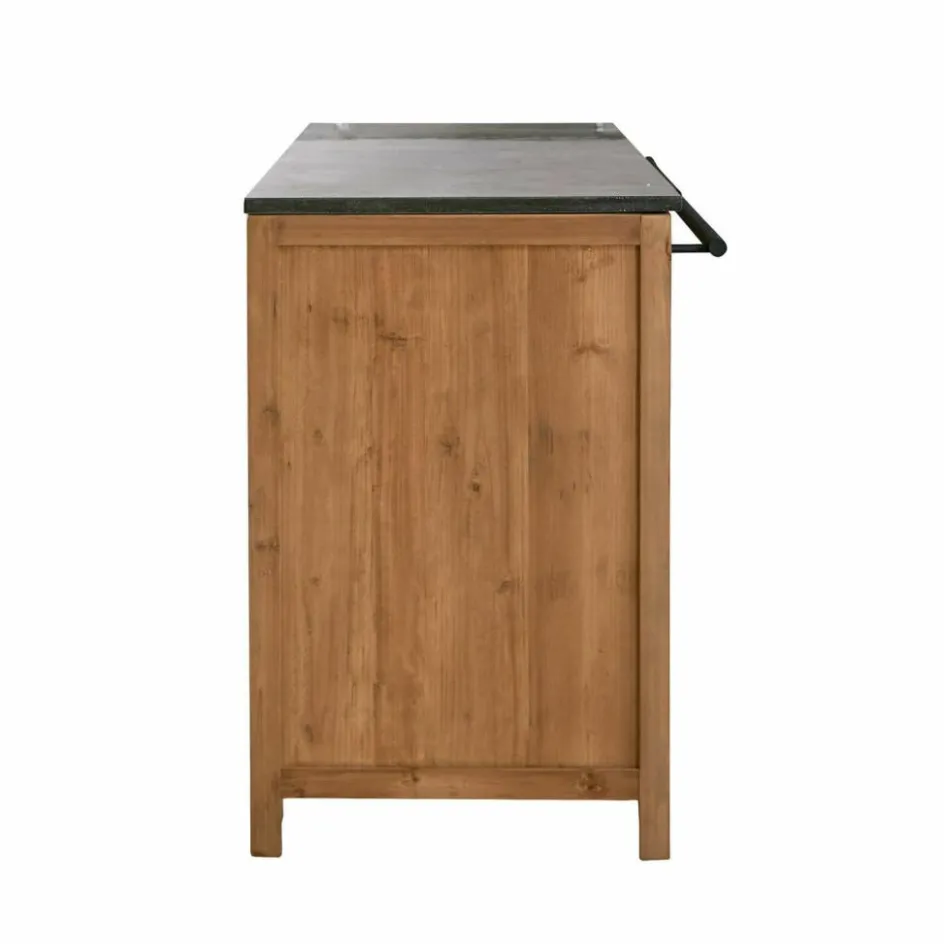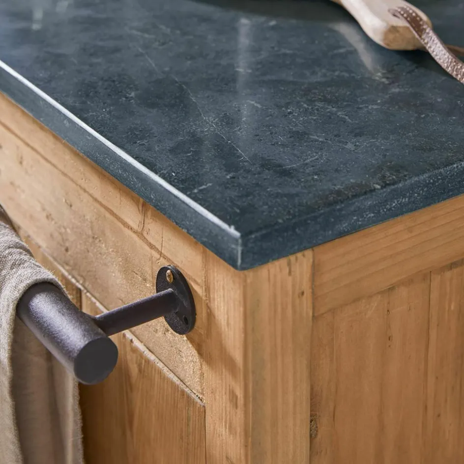 Dieser großzügige Küchenschrank ist die ideale Lösung für zusätzlichen Stauraum in Ihrer Küche. Mit seinen vier Schubladen und dem Stauraum hinter einer großen Tür bietet er Platz für alles, was Sie schnell zur Hand haben möchten, sei es Geschirr, Besteck oder Kochutensilien. Die massive Arbeitsplatte aus Blaustein ist besonders langlebig und pflegeleicht, perfekt für alle Arbeiten in der Küche. Das rustikale Tannenholz, aus dem der Schrank gefertigt ist, bringt Wärme und Natürlichkeit in Ihr Zuhause und unterstreicht den umweltfreundlichen Ansatz dieses Möbels. Eine zusätzliche Eisenstange kann zur Ablage von Handtüchern, Spültüchern oder anderen Dingen genutzt werden. Ein praktisches und zugleich ansprechendes Stück, das Ihre Küche komplettiert. Alternativ ist dieser Küchenschrank auch eine beeindruckende Kommode im Esszimmer.