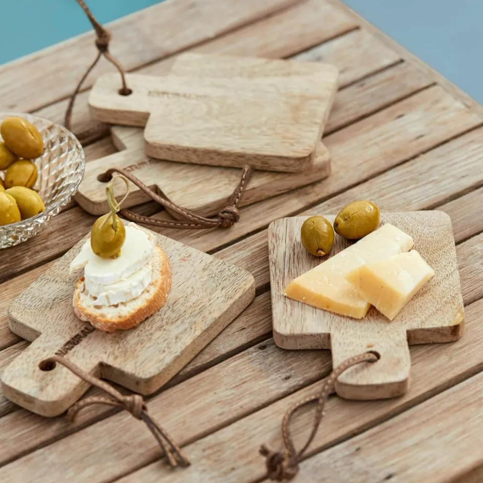 Wer rein natürliche und nachhaltige Materialien schätzt, wird dieses schicke Quartett mögen. Die hübschen Brettchen bestehen aus naturbelassenem Mangoholz mit schöner Maserung. Sie haben echte Lederbändchen zum Aufhängen, wodurch sie sich gut an der Wand verwahren lassen. Das spart auch Platz. Natürlich sind die Designs lebensmittelecht und eignen sich für vielerlei Leckereien – schneiden Sie darauf Obst und Gemüse oder richten Sie auf den ansprechenden Brettchen eine leckere Brotzeit an. Sie lassen sich auch wunderbar zum Picknick im Freien mitnehmen und machen lange Freude. Und wer möchte, könnte auch Dekoratives auf den hölzernen Brettchen anrichten, vielleicht Windlichter oder Fundstücke aus der Natur.