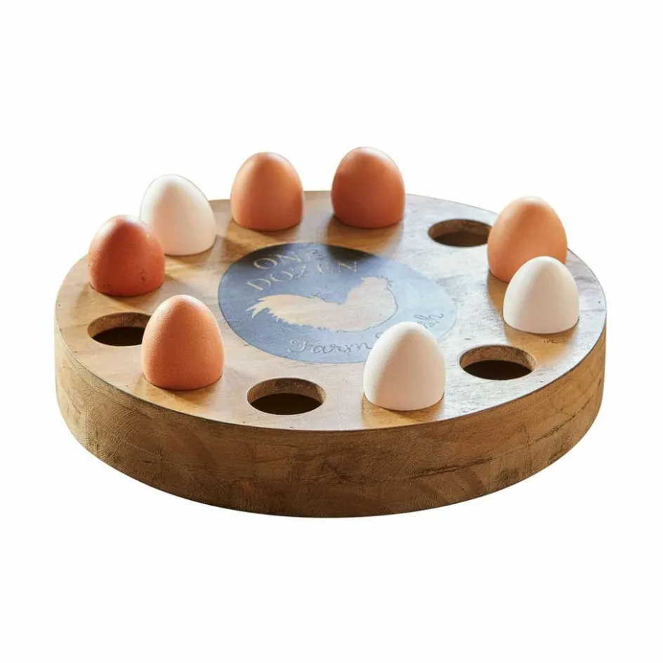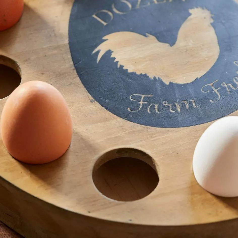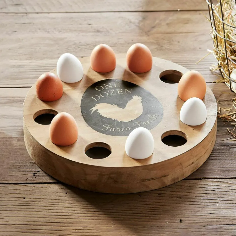 Dieser charmante Eierhalter mit Hühner-Verzierung ist nicht nur zu Ostern eine Freude – hier finden Eier das ganze Jahr über ein sicheres wie auch dekoratives Plätzchen. Für zwölf Eier ist hier Platz. Das schöne Design besteht aus naturbelassenem Tannenholz mit hübscher Maserung. Es versprüht gemütliches Landhaus-Flair und ziert Esstisch wie Küche. Zu Ostern schaffen Sie hiermit ein sehr charmantes Accessoire mit gefärbten Eiern, den Rest des Jahres könnten Sie darin die Frühstückseier ansprechend anrichten oder einfach gekaufte Eier in dem schicken Halter lagern. Ein Accessoire, welches ebenso nützlich wie auch dekorativ ist und einen Hauch Landleben in Ihr Heim zaubert.