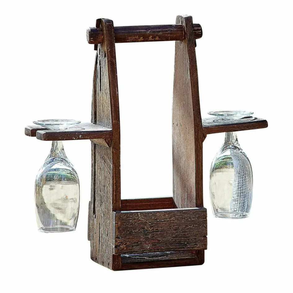 Dieser Flaschenhalter ist mehr als nur ein funktionales Accessoire – er erzählt Geschichten von altem Holz, das zu neuem Leben erwacht. Gefertigt aus wiederaufbereitetem Salbaumholz, besticht er durch seine authentische Ausstrahlung und die lebendige Struktur des Materials. Das rustikale Holzfinish verleiht ihm eine charmante Patina, die perfekt in gemütliche oder ländlich inspirierte Einrichtungen passt. Die beiden integrierten Gläser machen ihn zum idealen Begleiter für entspannte Abende zu zweit oder als liebevoller Hingucker auf dem gedeckten Tisch. Mit seinem praktischen Tragegriff lässt sich der Halter mühelos transportieren und bietet gleichzeitig eine dekorative Aufbewahrungslösung.