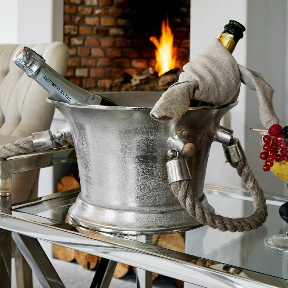 Sekt oder Selters? Egal. Mit diesem außergewöhnlichen Sektkühler schmeckt auch das Mineralwasser künftig fast so edel wie Champagner. Aus Aluminiumguss gefertigt und mit einem silberfarbenen Antik-Finish versehen, punktet das dekorative Gefäß mit einer hochwertigen Verarbeitung und einem ganz besonderen Design: Die seitlichen Henkel bestehen aus dickem Seil, was dem Sektkühler einen modern-maritimen Look verleiht. Unser Tipp: Verwenden Sie das edle Gefäß auch zweckentfremdet als Übertopf oder Vase – wenn Sie ihn nur zu Gesicht bekämen, sobald es etwas zu Feiern gibt, das wäre doch wirklich zu Schade.