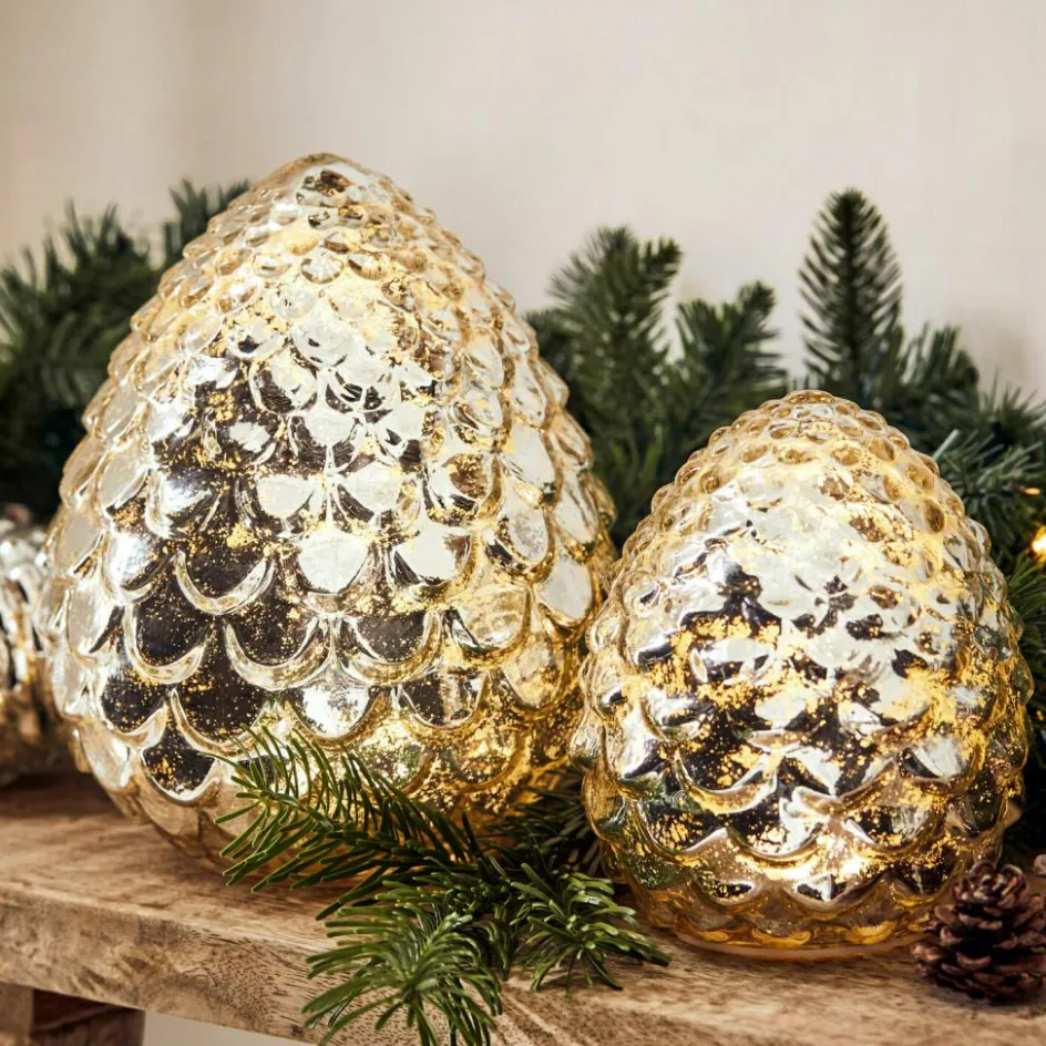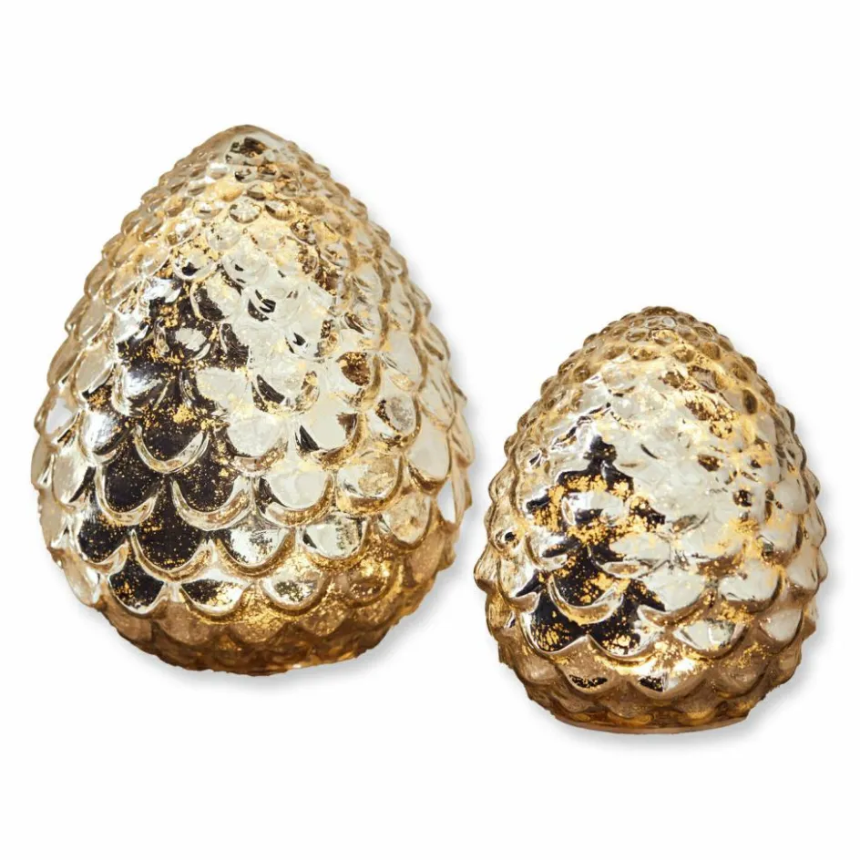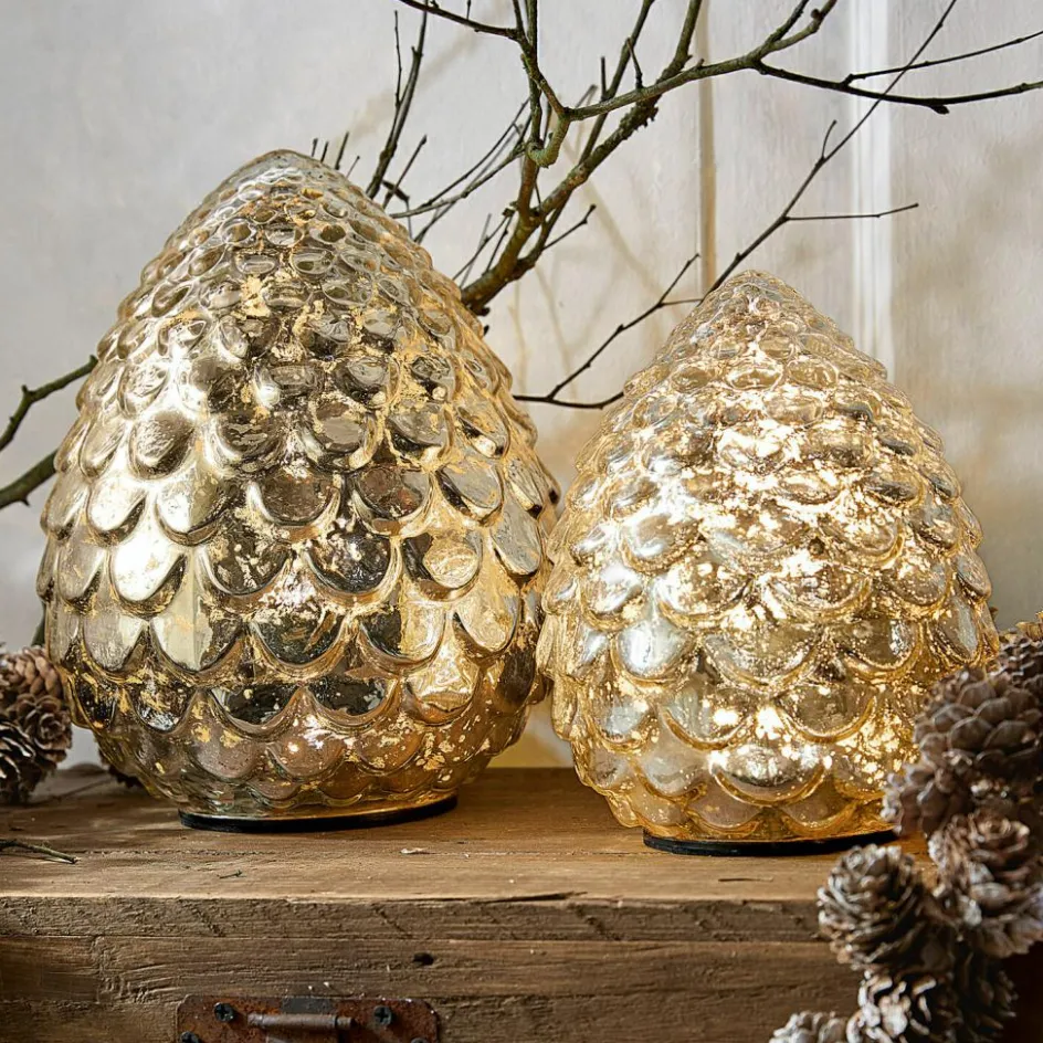 Wie kleine Schätze aus dem Winterwald – diese beiden stilisierten Zapfen sind eine wundervolle Dekoration für die kalten Tage. Sie bestehen aus feinem Glas mit Bauernsilber-Finish und machen sich sehr gut zum Shabby-Chic. Sie erhalten hier zwei Größen im Set. Das Besondere ist, dass die Schmuckstücke von innen mit kleinen LEDs erleuchtet werden können. Durch den Betrieb mit Batterien sind keine störenden Kabel nötig, und Sie sind absolut frei in der Platzwahl. Ob neben dem Bett, im Bad, zum Kekse backen in der Küche, oder am Fenster – erleben Sie eine sehr heimelige Lichtquelle mit viel Charme. An- wie auch ausgeschaltet sind die eleganten Zapfen ein toller Anblick, wodurch sie gleich eine doppelt gute Wahl sind. Hieran haben Sie den ganzen Winter über Freude.