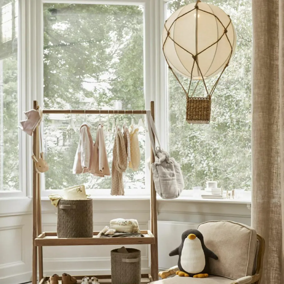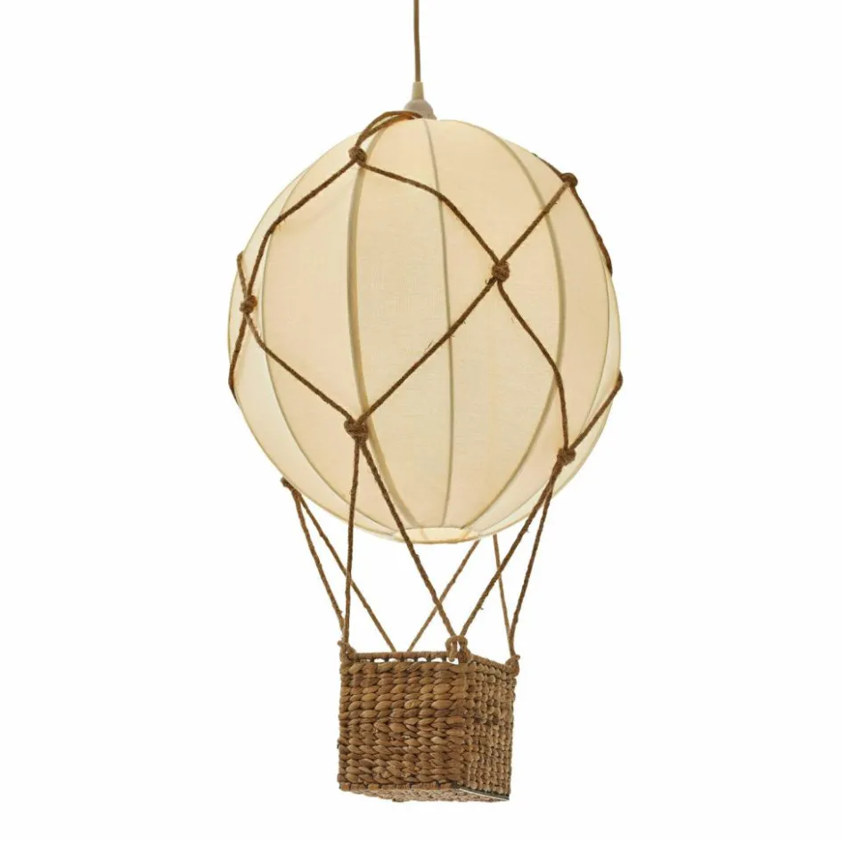 Tauchen Sie das Kinderzimmer in eine magische Welt mit dieser einzigartigen Hängelampe in Form eines Heißluftballons. Der Lampenschirm aus weicher Baumwolle verteilt das Licht sanft und schafft eine beruhigende Atmosphäre, ideal für ruhige Stunden und süße Träume. Besonders detailverliebt zeigt sich der kleine Ballon-Korb, der mit Jute umwickelt ist und an ein echtes Abenteuer erinnert. Diese Lampe kombiniert Funktionalität mit einem verspielten Design und ist der perfekte Hingucker für das Zimmer Ihres kleinen Schatzes.