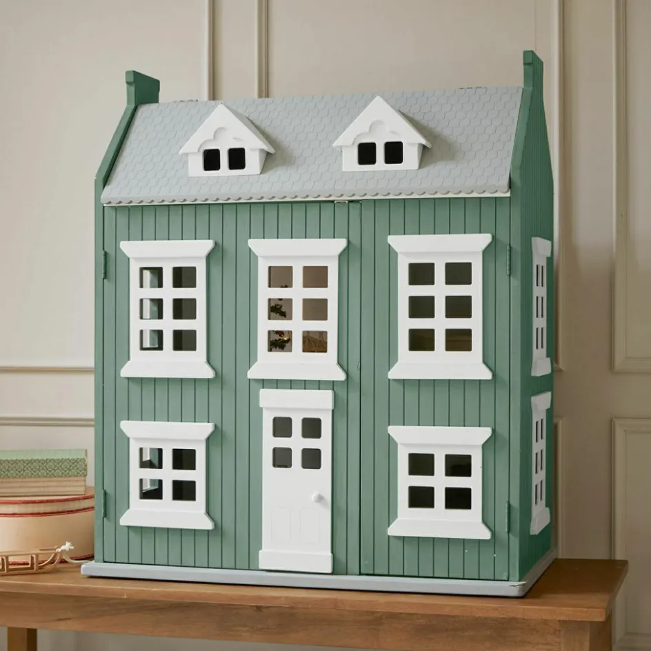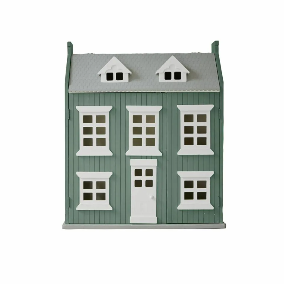 Wie aus einem Bilderbuch entflohen, steht dieses Puppenhaus da – mit seiner dezent grünen Holzfassade, dem eleganten Grau des Dachs und den kontrastierenden weißen Fensterrahmen. Die klassische Architektur mit Giebeln, aufklappbarem Dach und aufschwingenden Türen bringt nicht nur Spielspaß, sondern auch dekorativen Charme ins Kinderzimmer. Innen erwartet kleine Geschichtenerzähler ein liebevoll aufgeteiltes Zuhause für Puppen, Tiere und Fantasiewesen – bereit für Frühstück im Erdgeschoss, Geburtstagsfeiern im Dachgeschoss oder gemütliche Winternachmittage mit Kuscheldecken. Und wenn einmal aufgeräumt werden soll, wird aus dem Puppenhaus im Handumdrehen ein dekoratives Regal oder Ordnungshelfer an der Wand. Eine wundervolle Verbindung aus Spielwelt und Wohnaccessoire.
