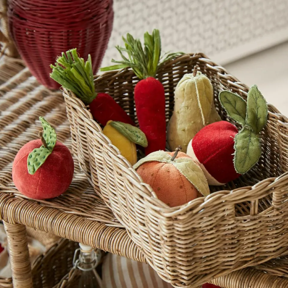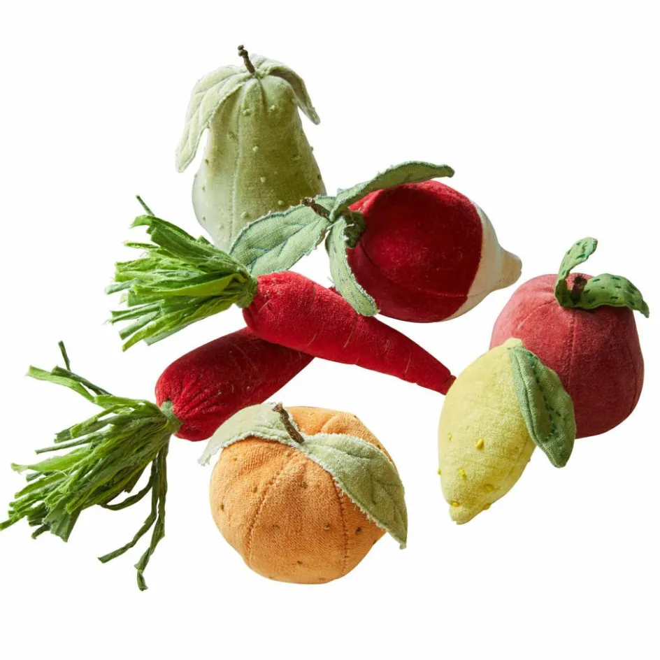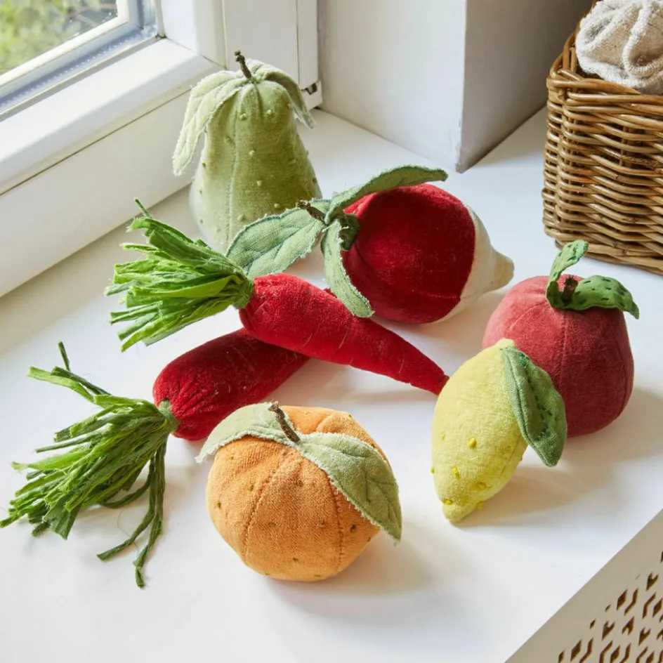 Mit diesem 7-teiligen Stoffset wird der Kaufladen zur Bühne für große Geschichten in kleinen Kinderhänden. Jeder Frucht- und Gemüsefreund ist sorgfältig gearbeitet – von der zartgrünen Birne mit ihren feinen Stickpunkten bis zur knackig-roten Möhre mit strukturiertem Blattgrün. Die sanften, matten Farben und die weiche Haptik schaffen eine behagliche, sichere Spielwelt. Dabei regen die realitätsnahen Formen die Sinne an und fördern spielerisch Kreativität und soziale Interaktion. Ob Rollenspiel oder erstes „Einkaufen“ – hier wird kindliche Fantasie genährt wie ein hungriger Bauch.