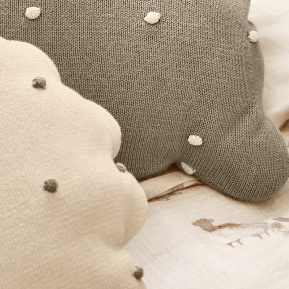 Zwei Kissen, die mehr als nur hübsch aussehen: Mit ihren sanft geschwungenen Konturen und der wolkenähnlichen Silhouette bringen sie Geborgenheit und Charme ins Kinderzimmer. Die dezente Stickerei in Form kleiner Punkte wirkt wie zarte Regentropfen auf flauschigen Wölkchen – verspielt, aber nicht kitschig. Beide Kissen sind aus weicher, gestrickter Baumwolle gefertigt und überzeugen mit einer wunderbar angenehmen Haptik. Ob als Blickfang im Bettchen, auf der Krabbeldecke oder in der Kuschelecke – dieses Set schafft ein liebevolles Ambiente, in dem sich Kinder geborgen fühlen.