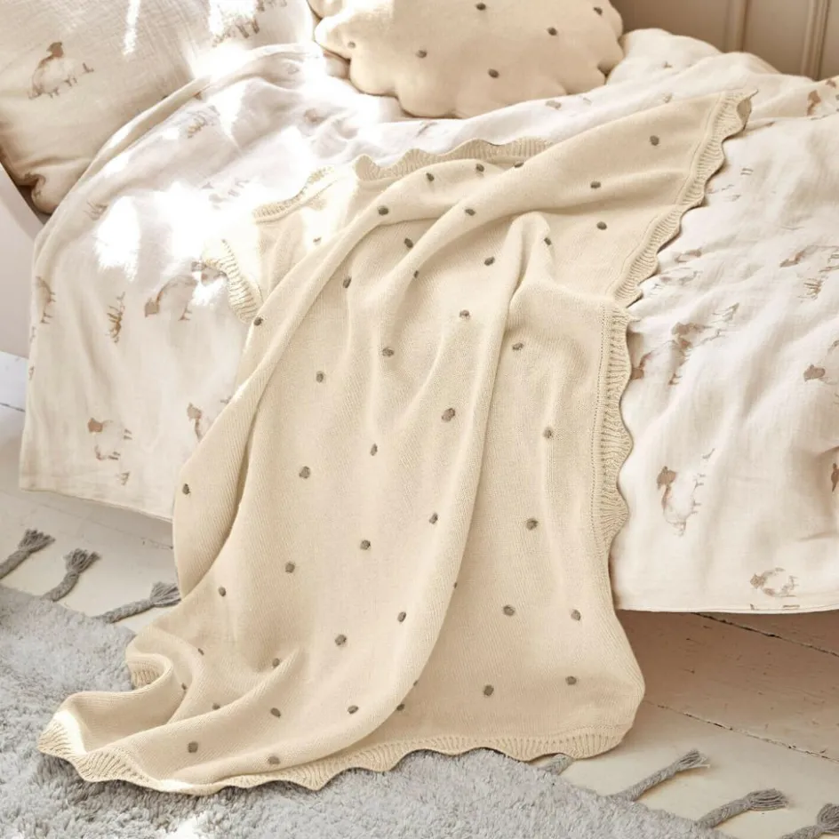 Mit diesem bezaubernden Plaid wird jedes Kuscheln zum kleinen Wohlfühlritual. Die weich gestrickte Baumwolle schmiegt sich sanft an die Haut und lädt zum Träumen ein – sei es im Kinderbett, auf dem Arm oder unterwegs im Kinderwagen. Die eingestickten Mini-Punkte sorgen für liebevolle Details und setzen verspielte Highlights. Der geschwungene Rand erinnert an eine Wolke und verstärkt die sanfte Anmutung dieses Lieblingsstücks. Ob als Geschenk zur Geburt oder als treuer Alltagsbegleiter – diese Decke schenkt Wärme, Geborgenheit und ein Lächeln.
