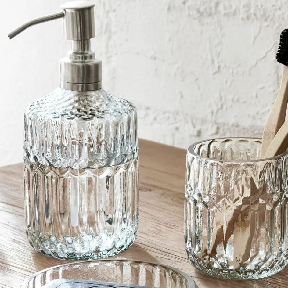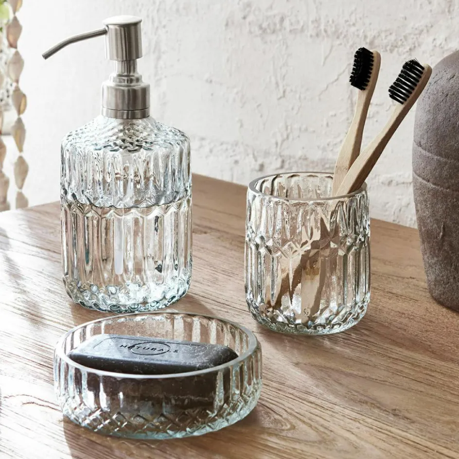 Wer auch bei kleinen Accessoires Wert auf edles Design legt, wird sich sofort in dieses Bad-Set verlieben. Alle Teile des Sets sind Meisterwerke traditioneller Handwerkskunst, für die das Glas erst von Mund geblasen und anschließend ebenso kunstvoll von Hand geschliffen wurde, so dass es sich jetzt mit einem noblen Relief-Dekor präsentiert, wie es früher in herrschaftlichen Bädern in Gebrauch war. Das Bad-Set besteht aus einem Seifenspender mit praktischem Pumpdosierer, einem Becher für die Zahnbürste und einer kleinen Seifenschale. In diese kleine Schale können Sie aber auch am Abend Ihren Schmuck ablegen oder Wattepads oder Badepralinen darin aufbewahren, ganz wie Sie möchten.