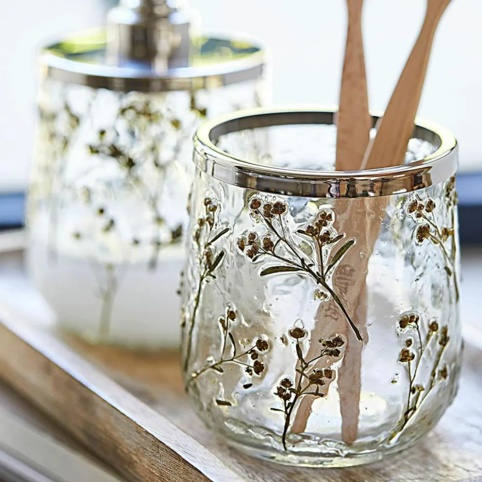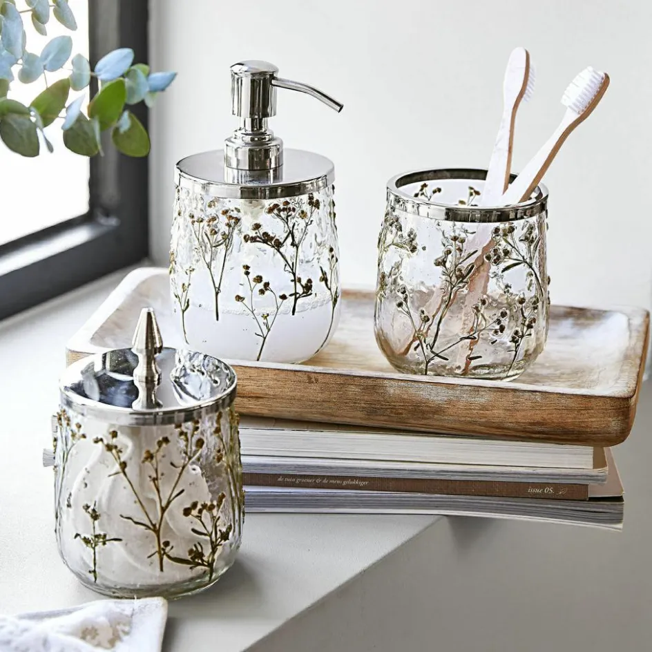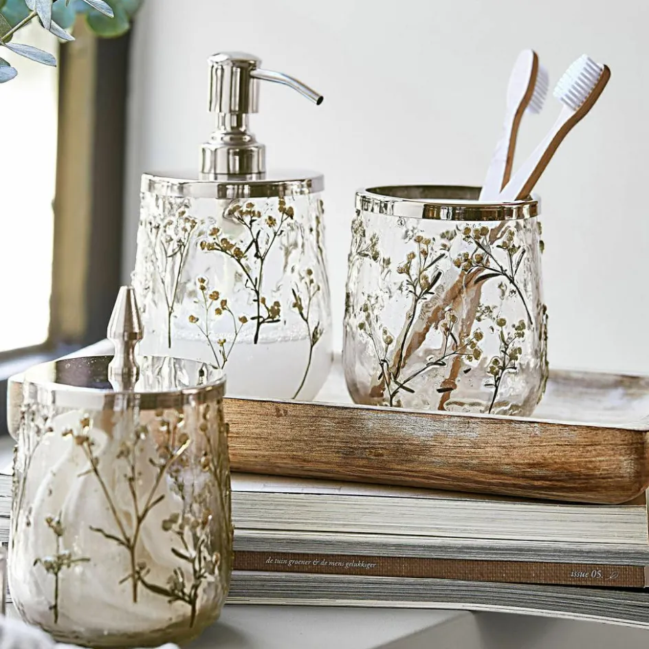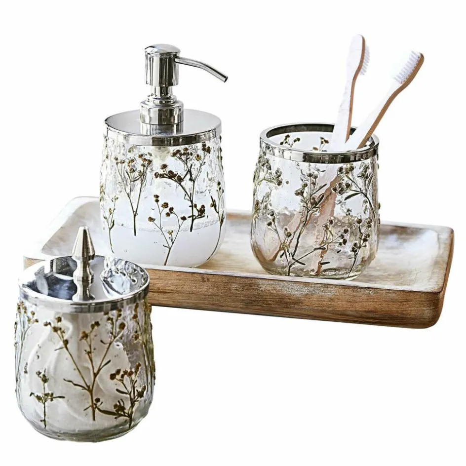 Freuen Sie sich auf ein ganz außergewöhnliches Design mit floralen Elementen und ländlichem Charme. Das edle Bad-Set besteht aus mundgeblasenem Glas mit fein eingearbeiteten, getrockneten Blüten, welche ihm eine sehr besondere Note geben. Es passt einfach perfekt zum Landhaus-Stil und vereint Nutzen und Dekoration ideal. Sie erhalten einen stilvollen Seifenspender, eine Dose für Watte etc. sowie ein Glas im harmonischen Set. Das Glas ließe sich auch für Schminkpinsel oder als kleine Vase nutzen. So wird Ihre Pflegeroutine zur wahren Freude, und Ihr Bad im Handumdrehen zu einem liebevoll dekorierten Wohlfühlort.