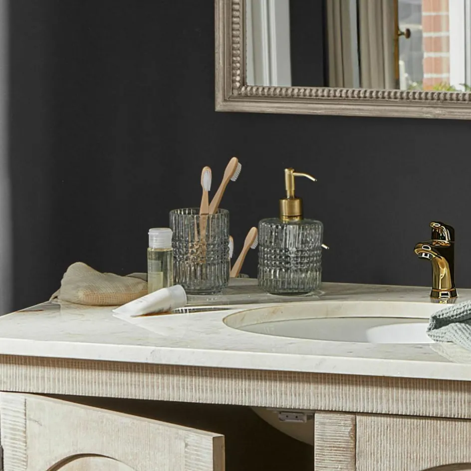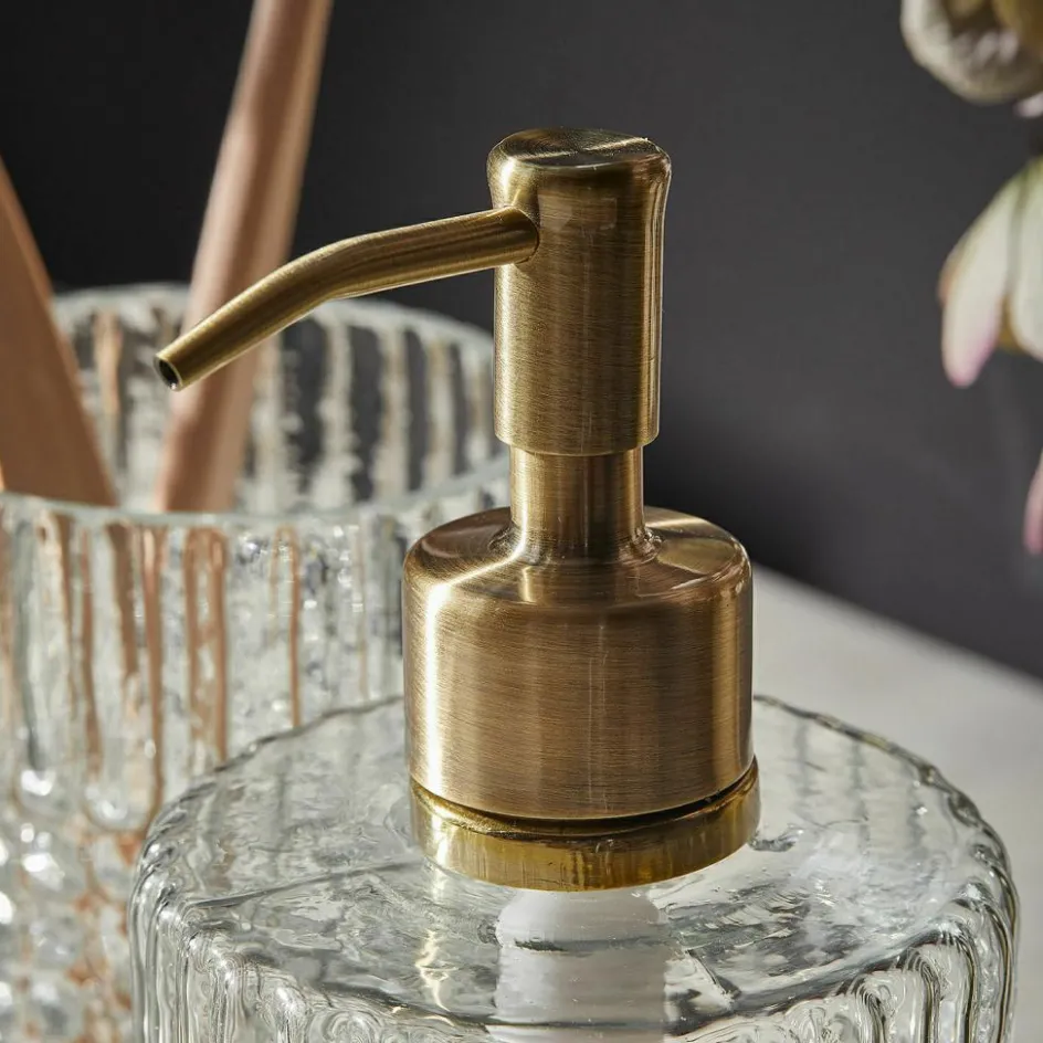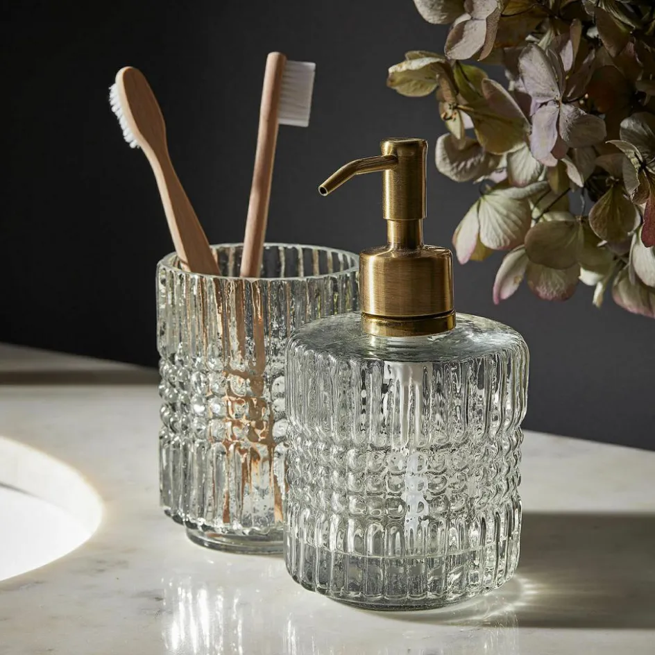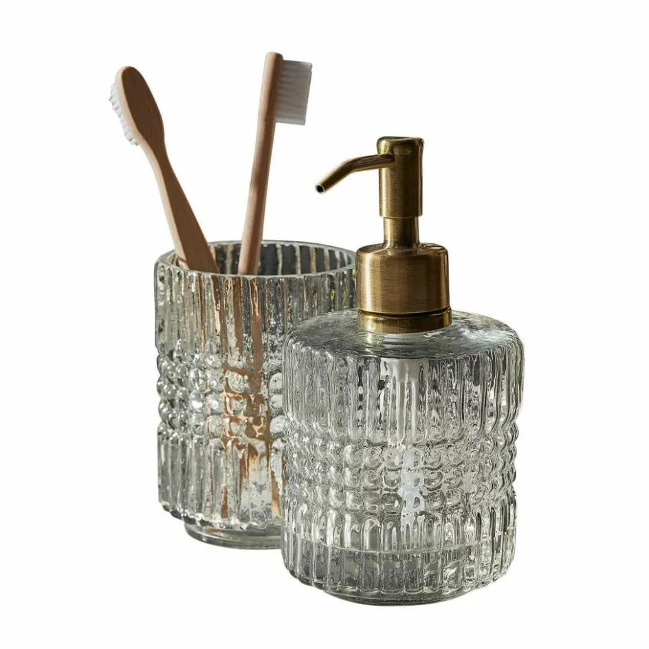 Ein Hauch nostalgischer Eleganz, eingefangen in Glas und Metall: Dieses zweiteilige Bad-Set vereint mundgeblasenes, kunstvoll geschliffenes Glas mit einem edlen Seifenspenderkopf aus messingfarbenem Edelstahl. Die strukturierte Oberfläche erinnert an klassische Kristalloptiken und sorgt für ein faszinierendes Spiel aus Licht und Reflexionen. Der Seifenspender und der passende Becher wirken wie aus einer anderen Zeit – und fügen sich doch wunderbar in moderne Bäder ein. Das warme Messing setzt einen charmanten Akzent und bildet einen spannenden Kontrast zum kühlen Glas. Perfekt für alle, die im Alltag nicht auf kleine Design-Highlights verzichten möchten.