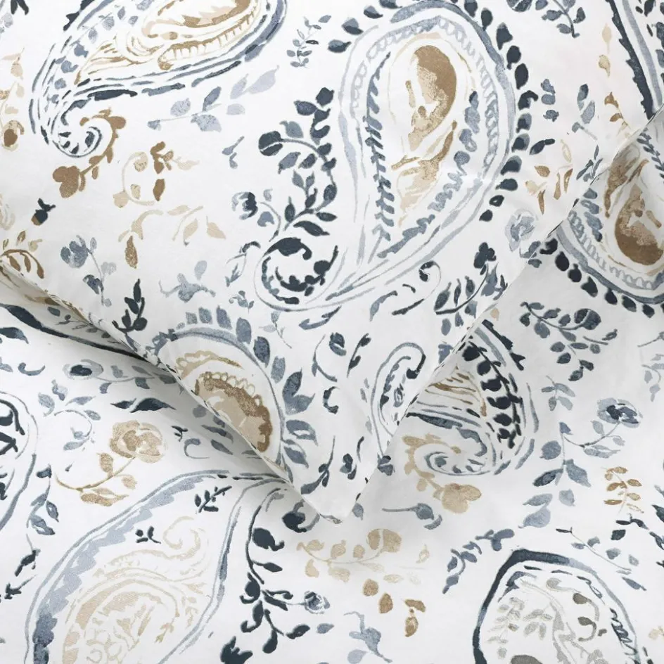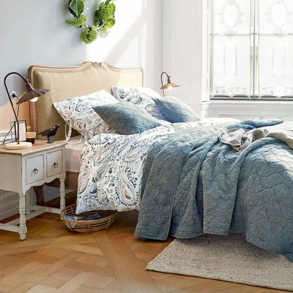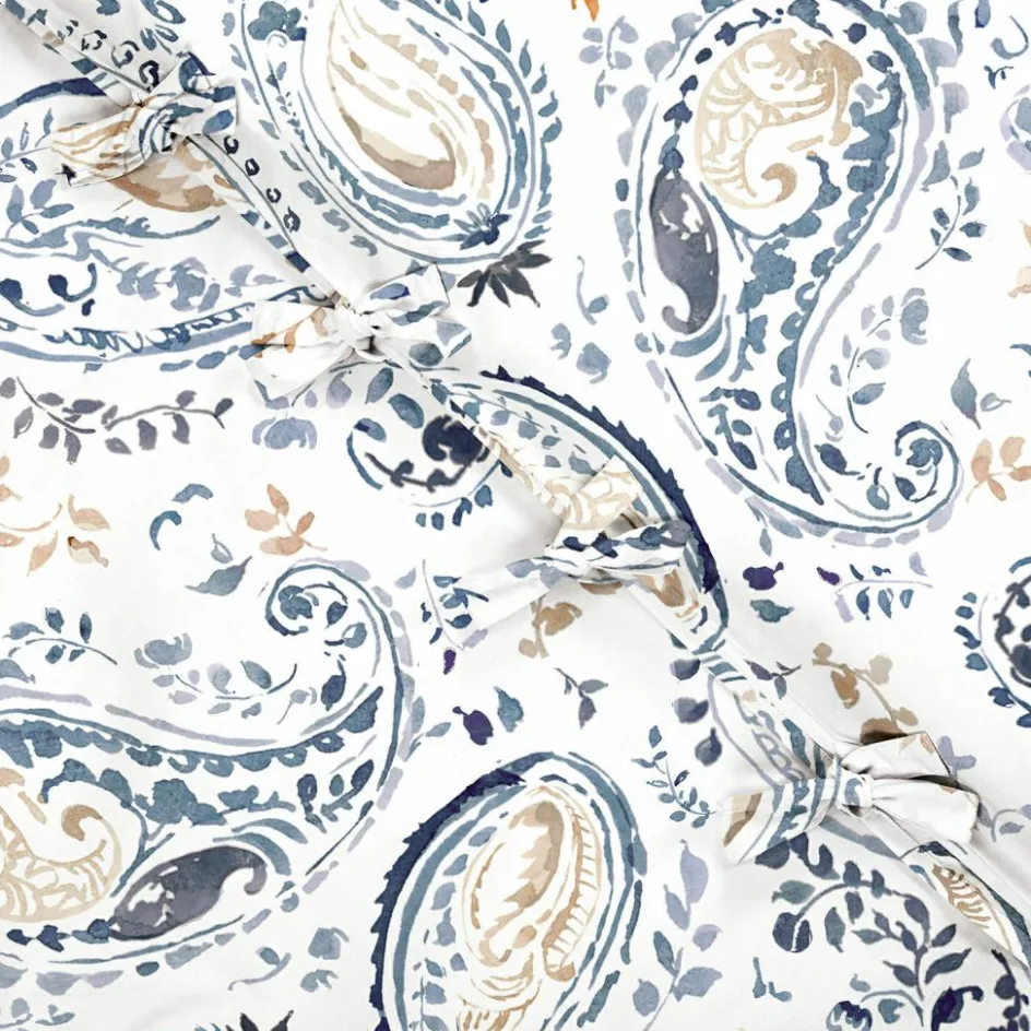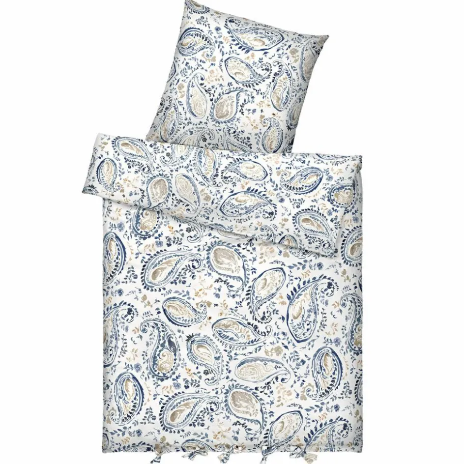 Wussten Sie, dass es sich bei dem Paisley-Motiv um eines der ältesten Desigins der Welt handelt? Seine Ursprünge liegen im Orient, doch schnell wurde es auch in Europa immer beliebter und bis heute ist dieser Motiv-Klassiker aus dem Interieur-Bereich nicht wegzudenken. Auf dieser Bettwäsche präsentiert es sich in frischen Blau-/Weiß-Nuancen und wirkt, als hätte ein berühmter Maler die Tropfen und ergänzenden floralen Motive mit dem Aquarellpinsel auf die weißgrundige Bettwäsche gemalt. Ein Muster, das nicht langweilig wirkt und trotzdem eine wunderbare Ruhe ausstrahlt, wie es für den Schlafraum empfehlenswert ist. Und weil das Design in hochwertigem Digitaldruck auf hautfreundlicher, reiner Baumwolle realisiert wurde, werden Sie sich mit Genuss am Abend in die Bettwäsche kuscheln und traumhaft gut schlafen. Für süße Träume sorgen vielleicht die Bindebänder, mit denen die Bettwäsche geschlossen wird und die für einen Hauch Romantik sorgen.