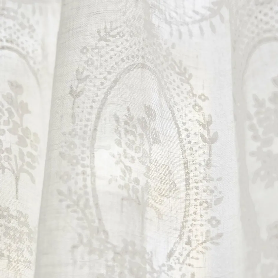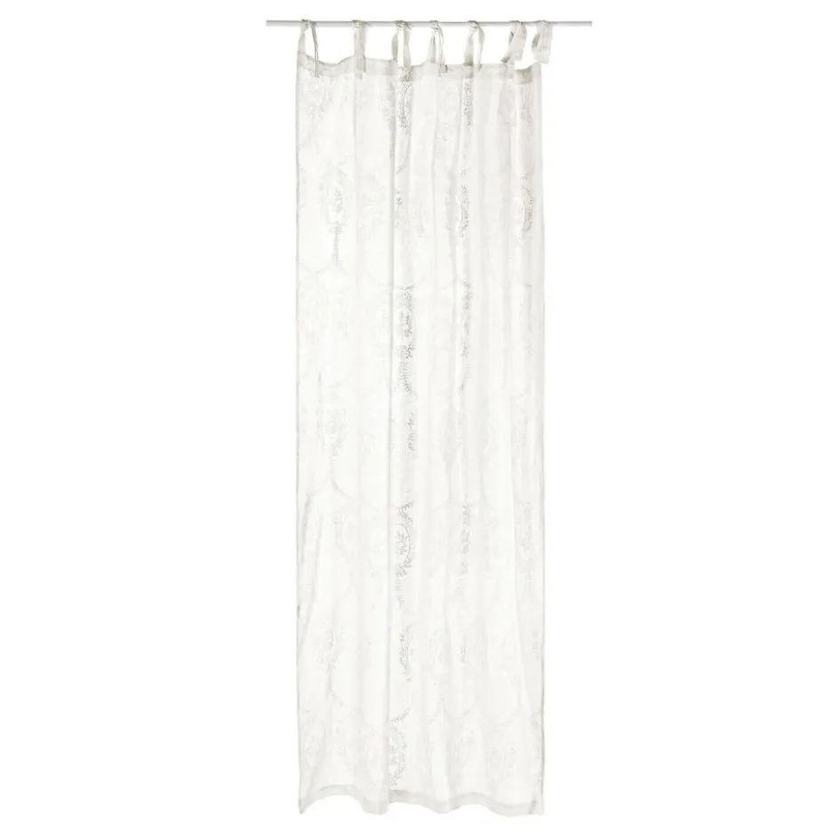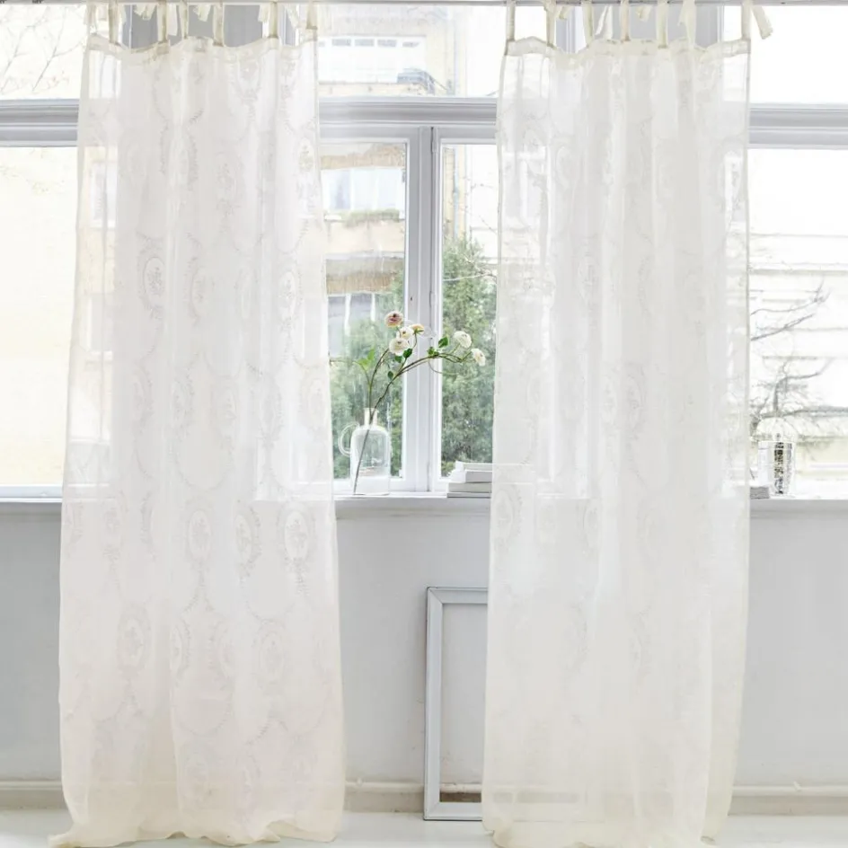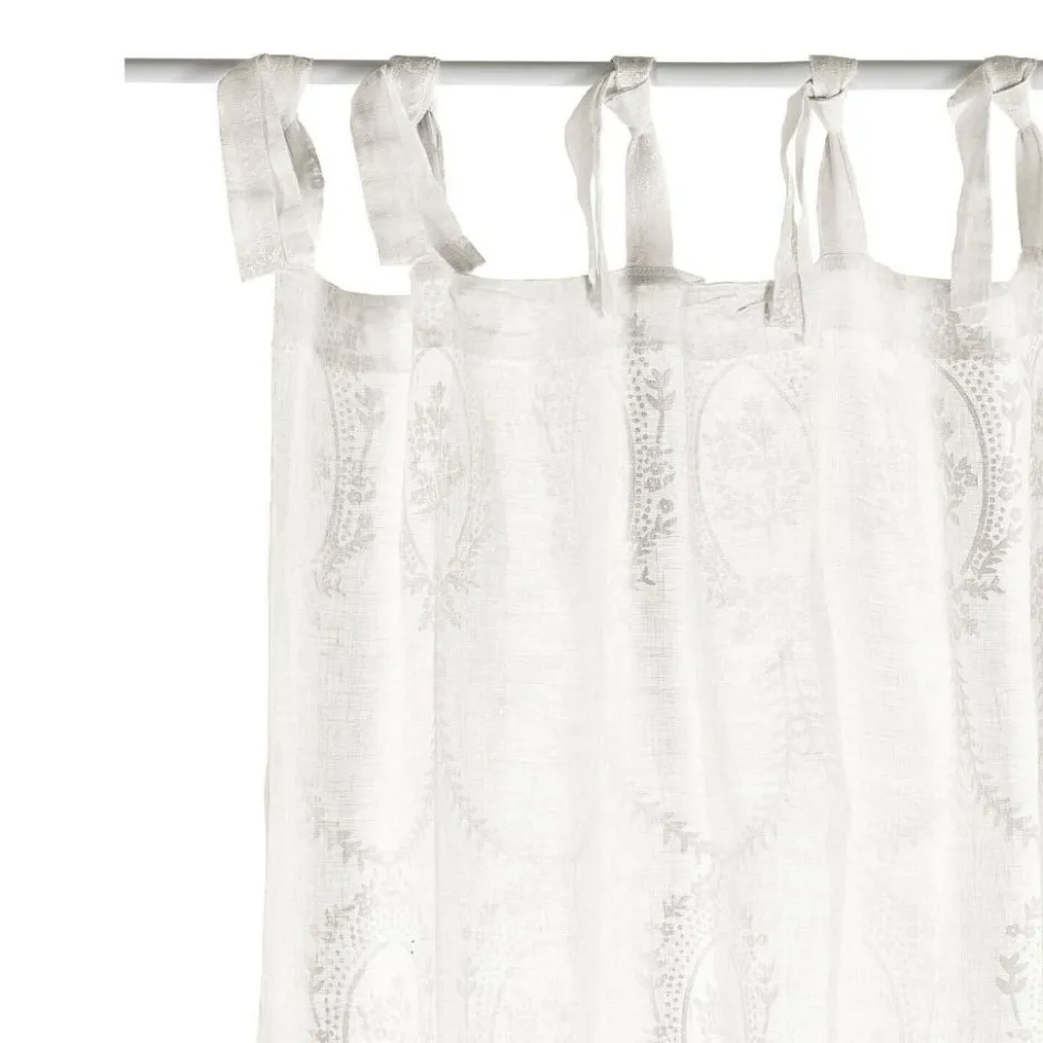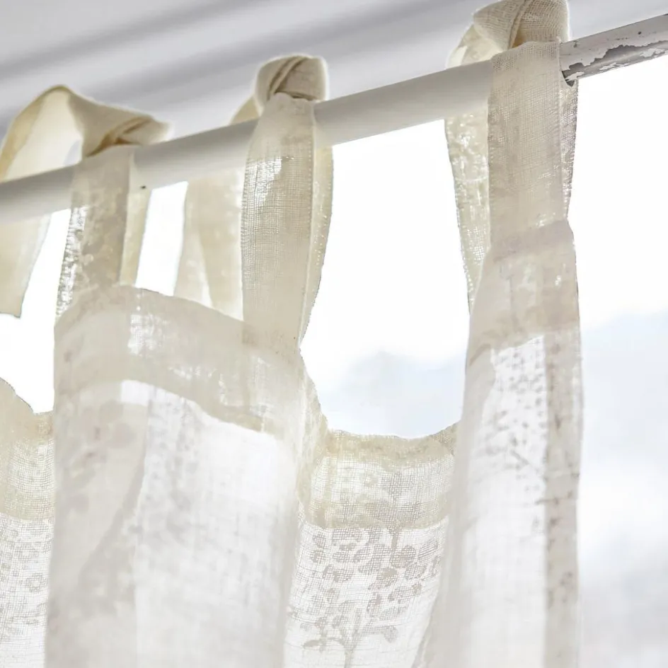 Als Blickfang für die Fensterpartie oder als leichter Sichtschutz eignet sich dieses liebreizende Accessoire gleichermaßen. Den zarten Leinenstoff zieren filigrane, aufgedruckte Muster. Befestigt wird der Vorhang mit hübschen Bindebändern an der Gardinenstange. Diese können entweder locker geknotet oder zu verspielten Schleifen gebunden werden. Je nachdem wie straff oder lose die Bänder an der Stange angebracht werden, kann die Länge des Stoffs um ein paar Zentimeter variiert werden. Dadurch haben Sie mehr Flexibilität für die Verwendung. Das Design passt wunderbar zu Räumen im romantischen Stil wie dem Shabby Chic. Auch zu klassischem Interior oder französischem Einrichtungsstil macht sich dieser reizvolle Hingucker einfach hervorragend. Werden weitere Accessoires mit verträumter Shabby-Note zu dem Stoff kombiniert, entsteht ein zauberhaftes Ambiente.