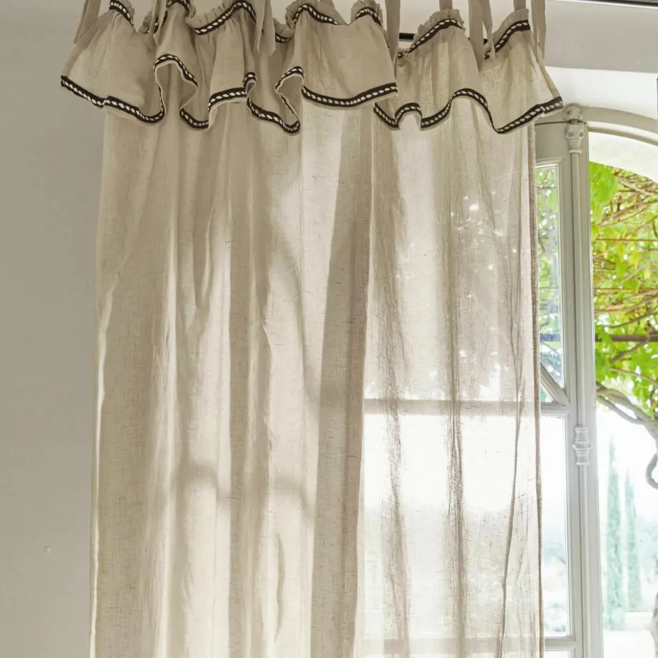 Suchen Sie nach einer Gardine, die nicht nur nützlich, sondern auch dekorativ ist? Diese Gardine erfüllt beides. Der breite Rüschensaum in Form eines breiten Volants, umgeben von schwarzen Zierstreifen mit eingezogenen, weißen Fäden, verleiht Ihrem Raum einen zauberhaften und außergewöhnlichen Look. Der dunkle Zierstreifen ähnelt in seiner Optik fast einer Perlenschnur. Hergestellt aus Baumwolle und Leinen und mit sieben Bindebändern versehen, passt sie ideal zum Landhausstil, aber auch perfekt in jede andere Einrichtung. Schaffen Sie ein schönes Ambiente in Ihrem Zuhause und genießen Sie den stilvollen Luxus dieses edlen Schmuckstücks!
