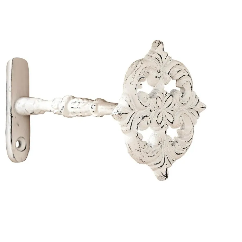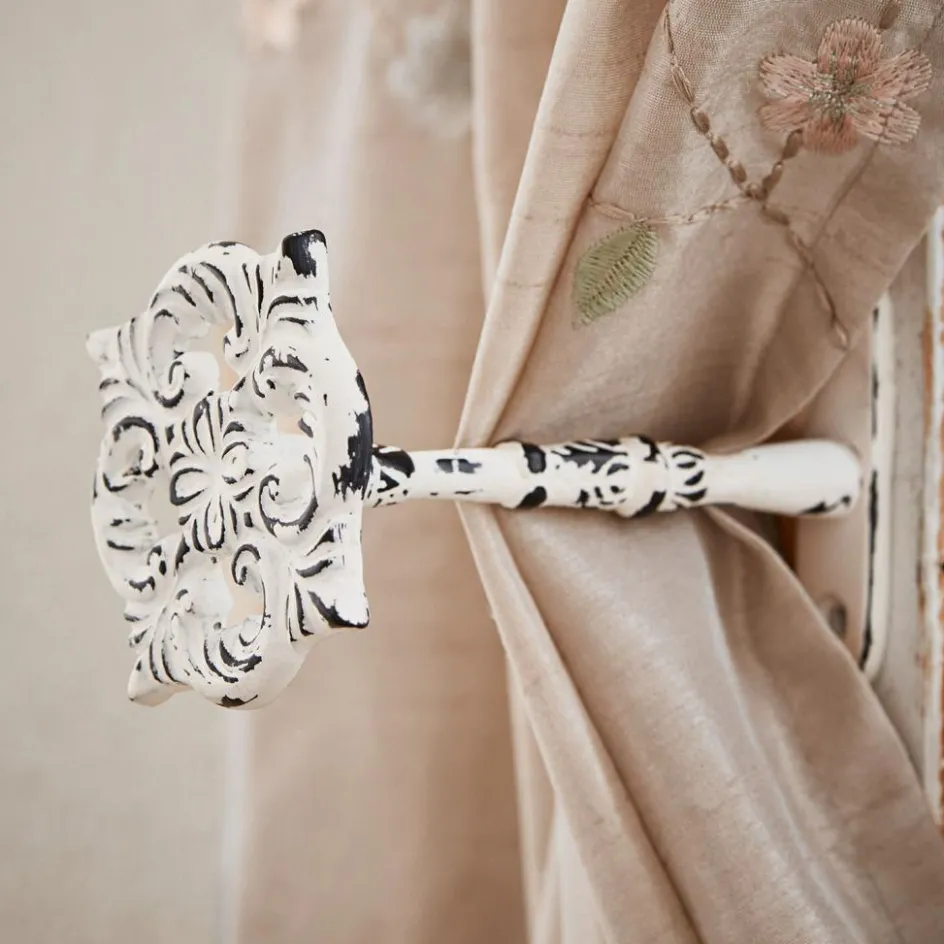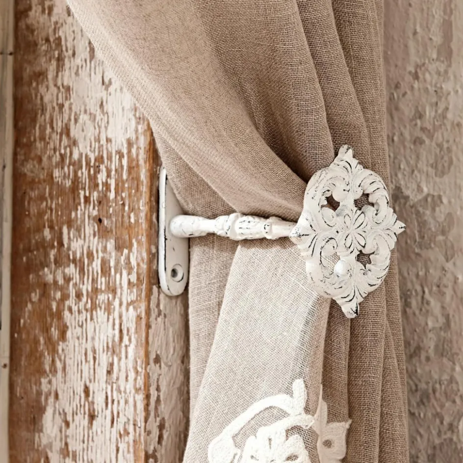 Die beiden Vorhanghalter mit ihrer filigran ausgearbeiteten, blütenförmigen Ornamentik lassen viel Raum für eine kreative Fenstergestaltung. Besonders schön harmonieren die beiden mit der passenden Gardinenstange und setzen so jede Gardine und jeden Vorhang perfekt in Szene. Aus reinem Aluminium in Antikweiß gefertigt, wirken sie dank der charmanten Shabby-Lackierung wie ein echtes Erbstück und passen daher auch ganz wunderbar zu einer Einrichtung im Landhaus-Stil. Zur Wandmontage.