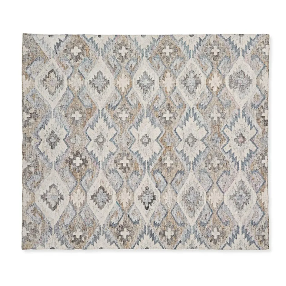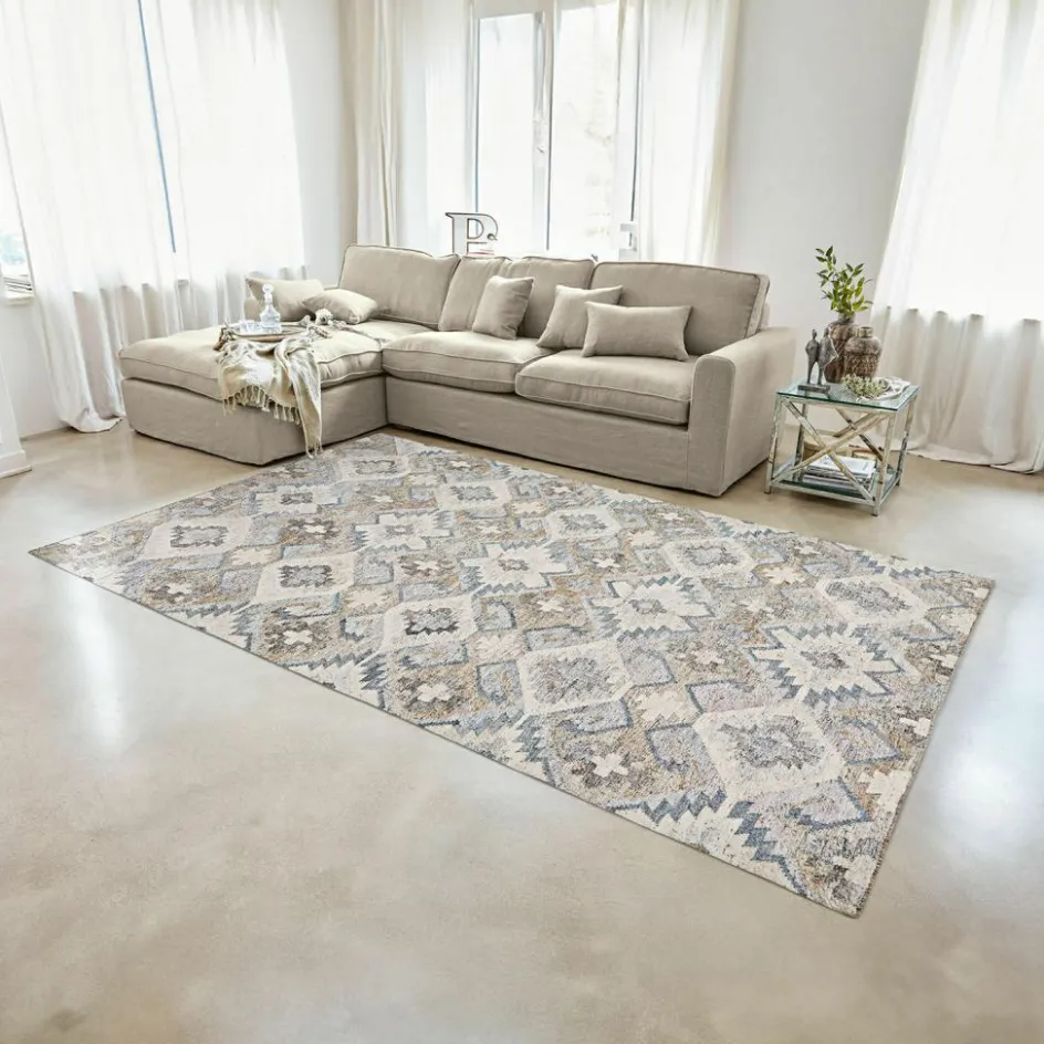 Wenn das Interieur eher schlicht und zurückhaltend ist, dürfen die Wohnaccessoires gerne etwas auffälliger sein. Ganz so wie dieser hochwertige Teppich in wunderschönem Allover-Muster. Die richtige Farbabstimmung wirkt Wunder: Durch die Kombination von edlen, dezenten Farbnuancen genießt er eine besonders elegante Ausstrahlung und lenkt alle Blicke auf sich. Umweltschonend hergestellt aus wiederaufbereiteten PET-Flaschen macht der Teppich auch in Sachen Nachhaltigkeit keine Kompromisse. Die nicht wieder verwendbaren PET-Flaschen werden eingeschmolzen und durch Spinnmaschinen zu Garnen verarbeitet. Kunstvoll von Hand gewebt ist er nicht nur weich in der Haptik wie man es sonst nur von Indoor-Teppichen kennt, sondern enorm strapazierfähig sowie wasser- und schimmelresistent. So ist der Teppich durchaus outdoorfähig und ideal für Räume und Plätze, wo etwas mehr Schmutz und Feuchtigkeit entstehen kann – zum Beispiel unter dem Esszimmertisch, im Badezimmer oder in der Küche.