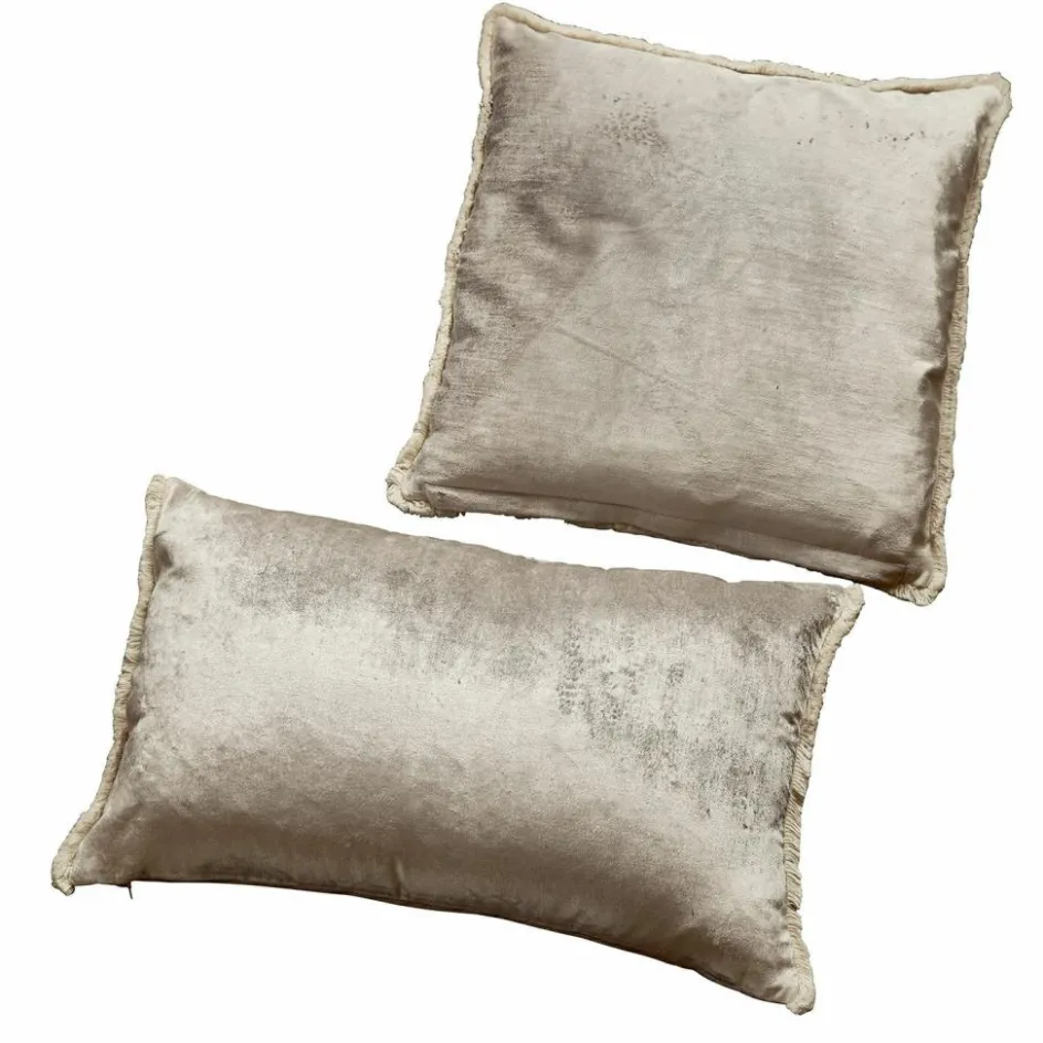 Erleben Sie den ultimativen Luxus mit diesem beeindruckenden Set aus zwei Kissenhüllen, die in jeder Hinsicht die Perfektion des Handwerks betonen. Diese Kissenhüllen sind aus schimmerndem Viskosesamt gefertigt und fangen das Licht ein, das die kunstvollen Stickereien in einem blendenden Spiel von Licht und Schatten hervorhebt. Die weiche Baumwolle auf der Rückseite sorgt für ein angenehmes Hautgefühl, während die sorgfältig angebrachten Fransen an den Seiten jedes Kissen zu einem echten Blickfang machen. Ideal für jeden, der sein Zuhause mit einem Hauch von klassischer Eleganz und zeitloser Schönheit bereichern möchte.