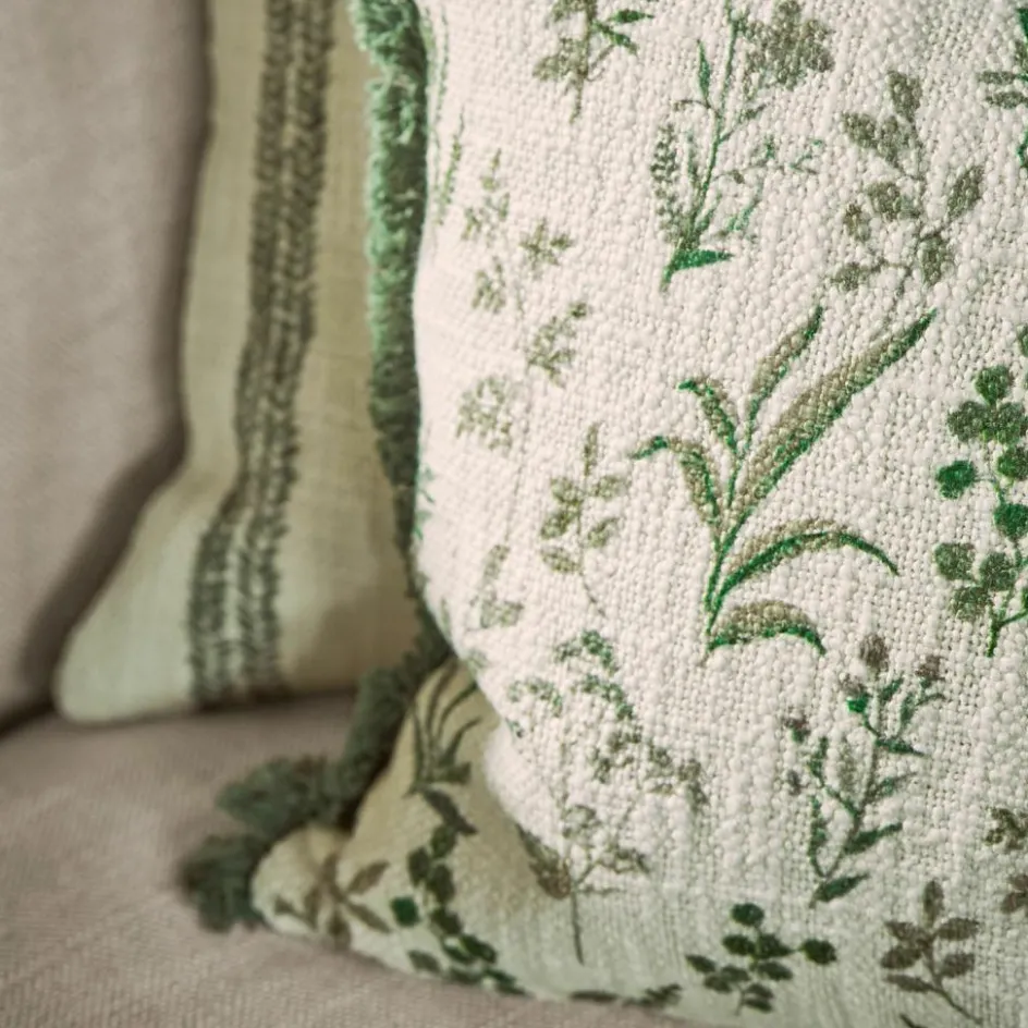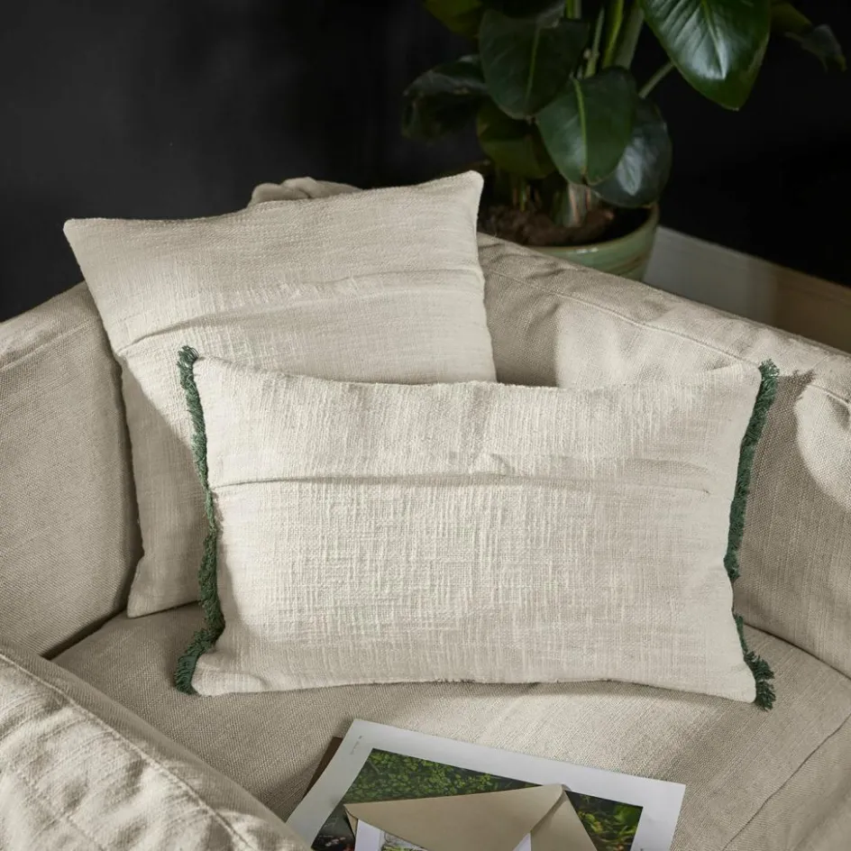 Diese beiden Kissenhüllen sprechen eine gemeinsame Sprache – die der Natur –, erzählen jedoch ihre Geschichte auf ganz eigene Weise. Während das eine Modell mit grünen Zweig-Streifen für Ruhe und Ordnung sorgt, wirkt das andere durch sein florales Allover-Muster lebendig und verspielt. Die sanfte Farbgebung in Creme und Grün schafft eine wunderbar natürliche Atmosphäre, die sich mühelos in bestehende Interieurs einfügt – ob im Wohnzimmer, Wintergarten oder auf der Gartenbank. Die strukturierte, gewebte Baumwolle verleiht den Hüllen eine griffige, hochwertige Haptik. Ein Set, das Natürlichkeit und Abwechslung stilvoll vereint.