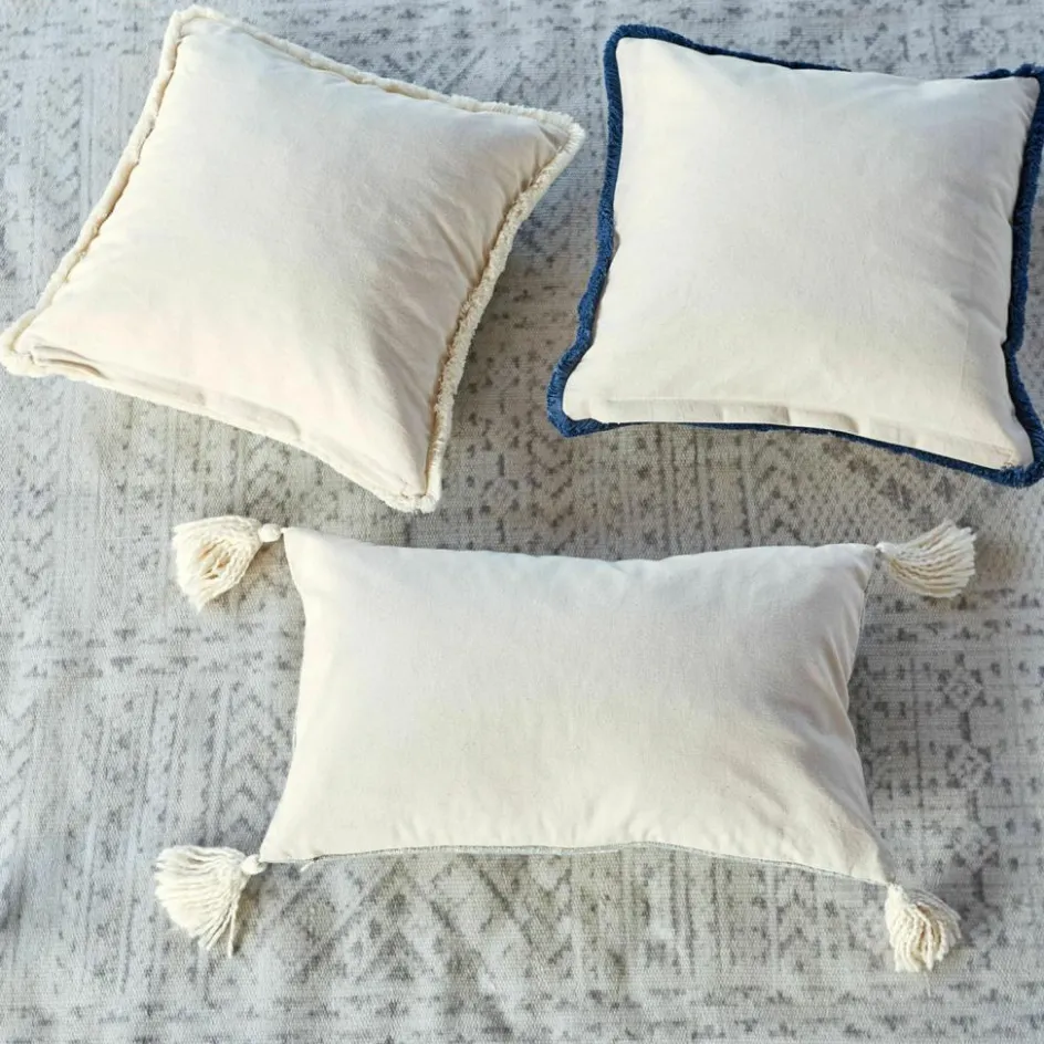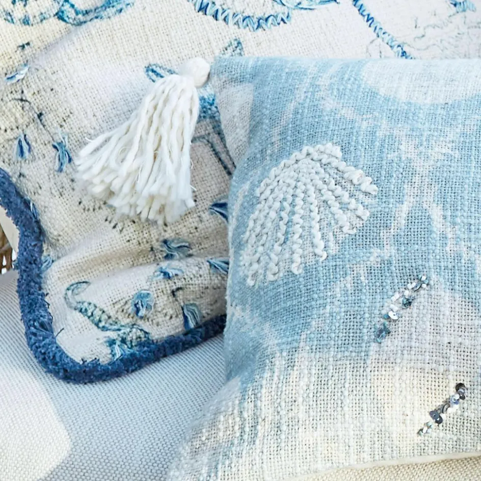 Verwandeln Sie Ihr Zuhause in eine stilvolle Küstenoase mit diesem Kissenhüllen 3er Set. Die detailreichen Prints und dezenten Stickereien in zarten Blau- und Naturtönen spiegeln die Schönheit des Meeres wider und verleihen jedem Raum eine beruhigende Note. Muscheln, Seesterne und zarte Korallenmuster sind kunstvoll in das weiche Baumwollmaterial eingearbeitet, und die funkelnden Pailletten und kleinen Glasperlen setzen dezente Highlights. Abgerundet wird das Design durch dekorative Quasten an den Ecken, die für eine Extraportion Gemütlichkeit sorgen, wie auch fast flauschige Umrandungen an den anderen beiden Kissen. Ideal für Sofa, Bett oder als dekoratives Element in Ihrem Lieblingssessel – diese Kissenhüllen versprühen maritimen Charme und laden zum Entspannen ein.